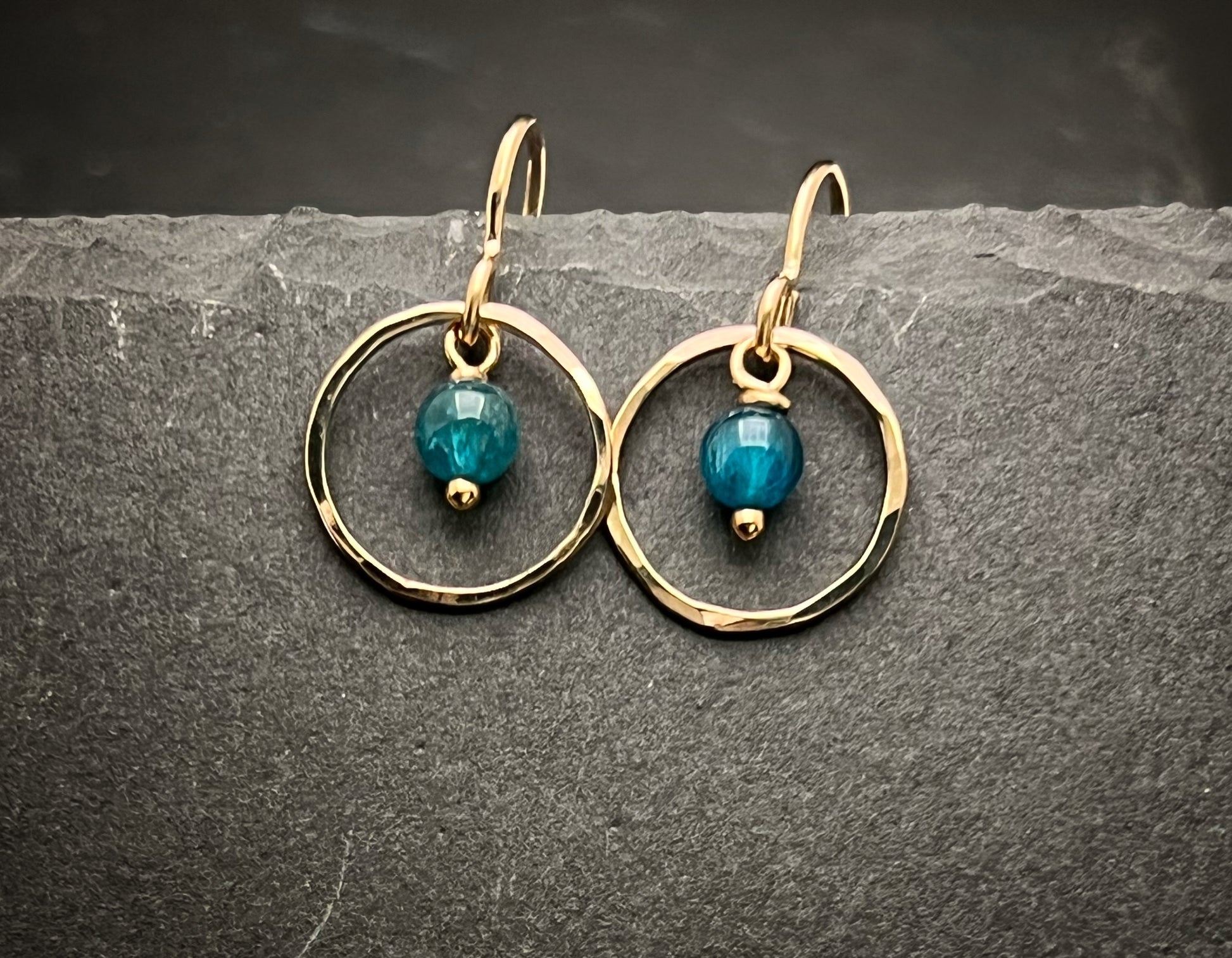 14 Karate gold and apatite earrings. The hand forged hoop is made from 14 karate gold fill wire and have apatite gemstone wire wrapped to hang at the bottom.