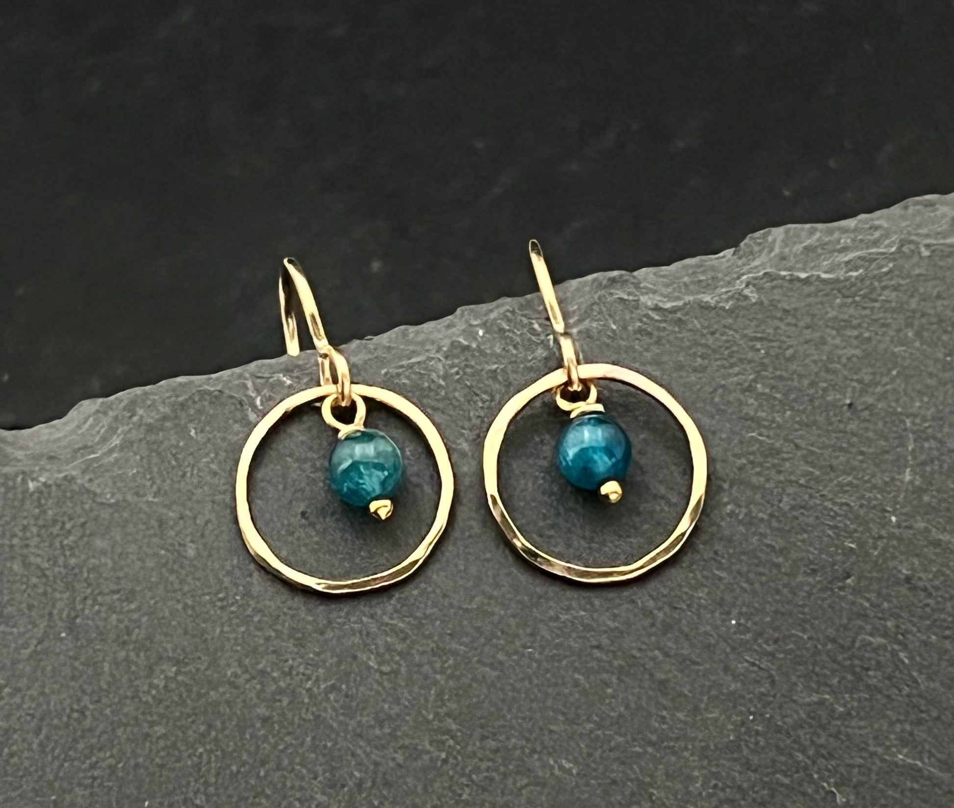Gold-filled hammered hoop earrings featuring faceted blue apatite gemstones. These lightweight earrings add a vibrant pop of color and are perfect for everyday wear or dressing up your look.