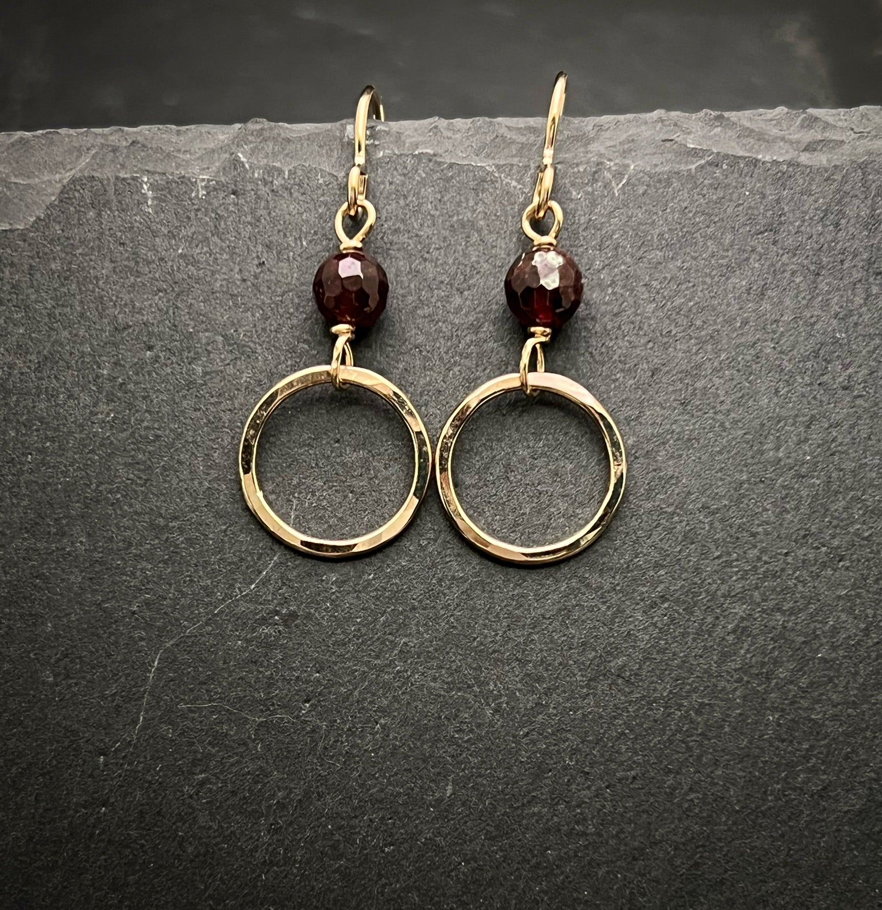 14 Karate gold and garnet earrings. The hand forged hoop is made from 14 karate gold fill wire and have garnet gemstone wire wrapped to hang at the top.