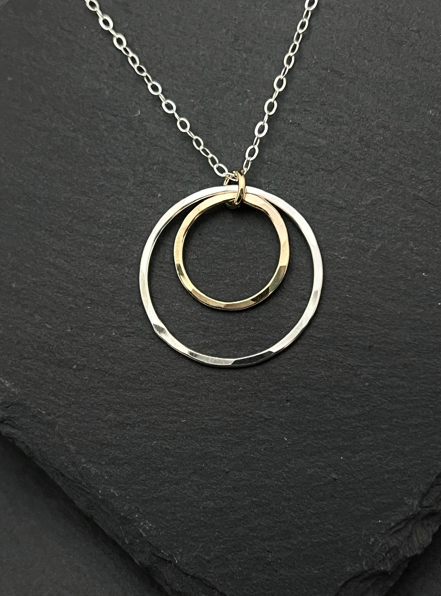 Mixed-metal necklace featuring two hand-forged hammered rings in sterling silver and gold-filled. Suspended from a delicate sterling silver chain for a modern, minimalist look.