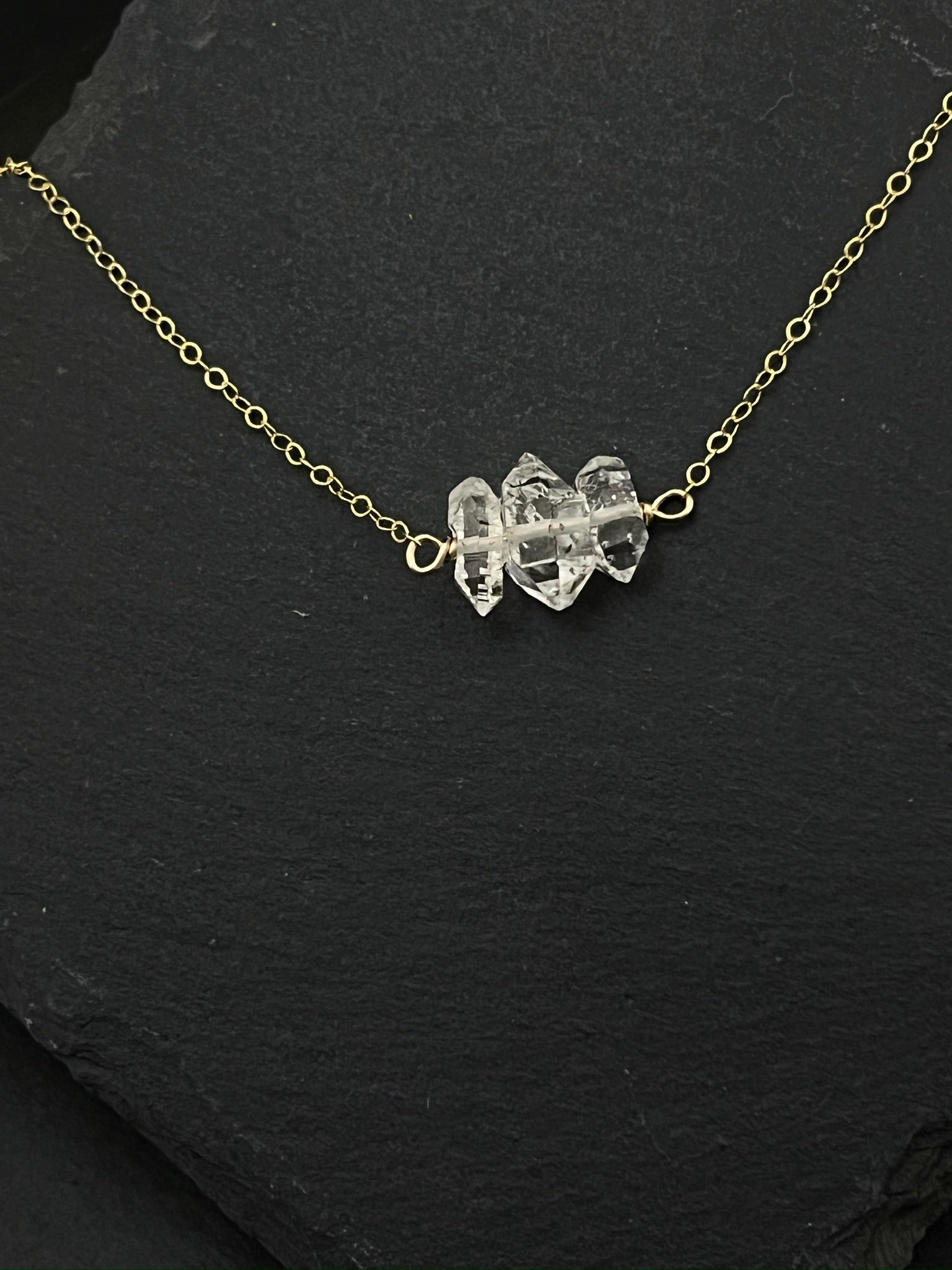 Gold-filled necklace featuring a row of Herkimer Diamond points. Minimal and elegant, perfect for layering or wearing on its own.