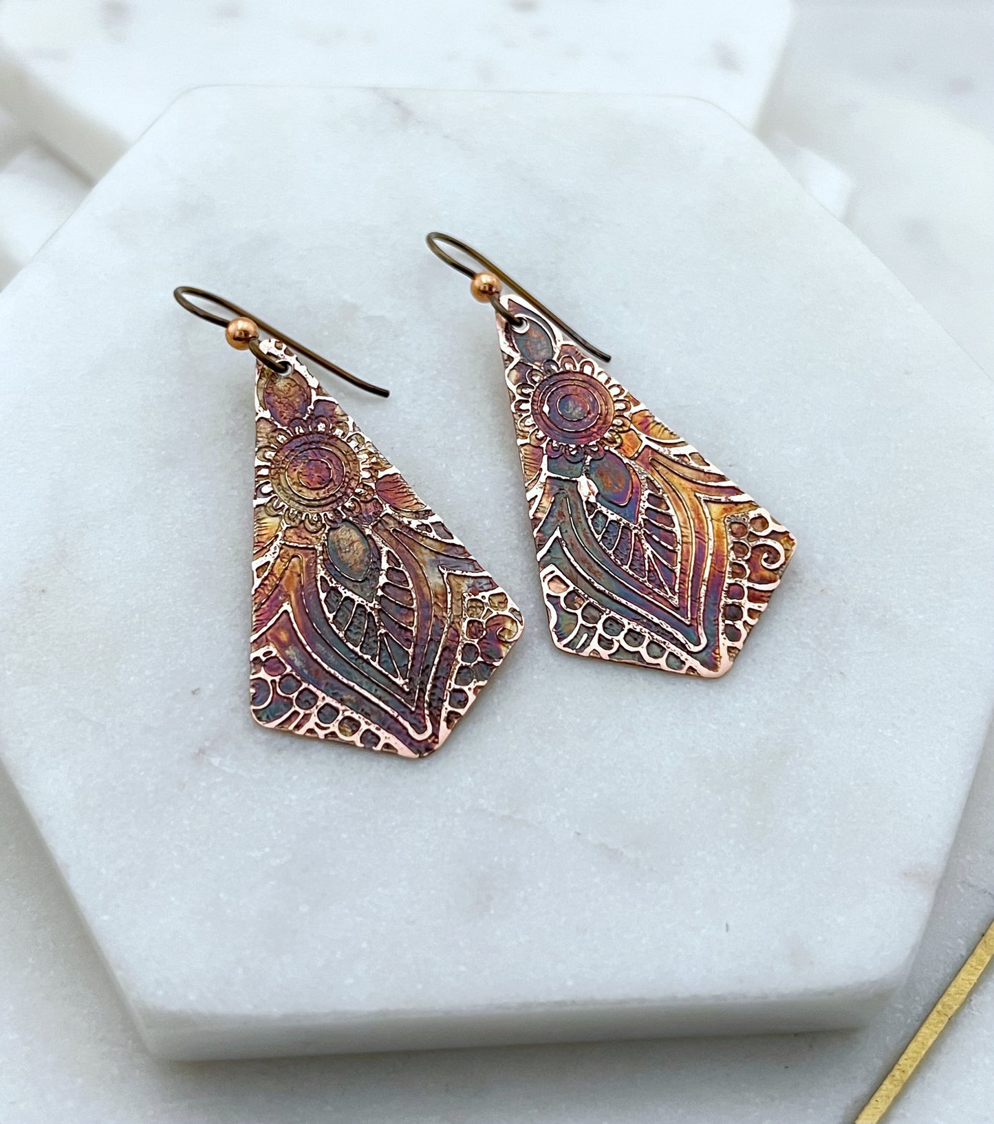 Acid etched copper earrings. These have been hand cut and etched, then colored with chemical patina and sealed to prevent tarnish. Ear wires are made from hypoallergenic Niobium metal. Earrings are 1.75 inches long by an inch wide.