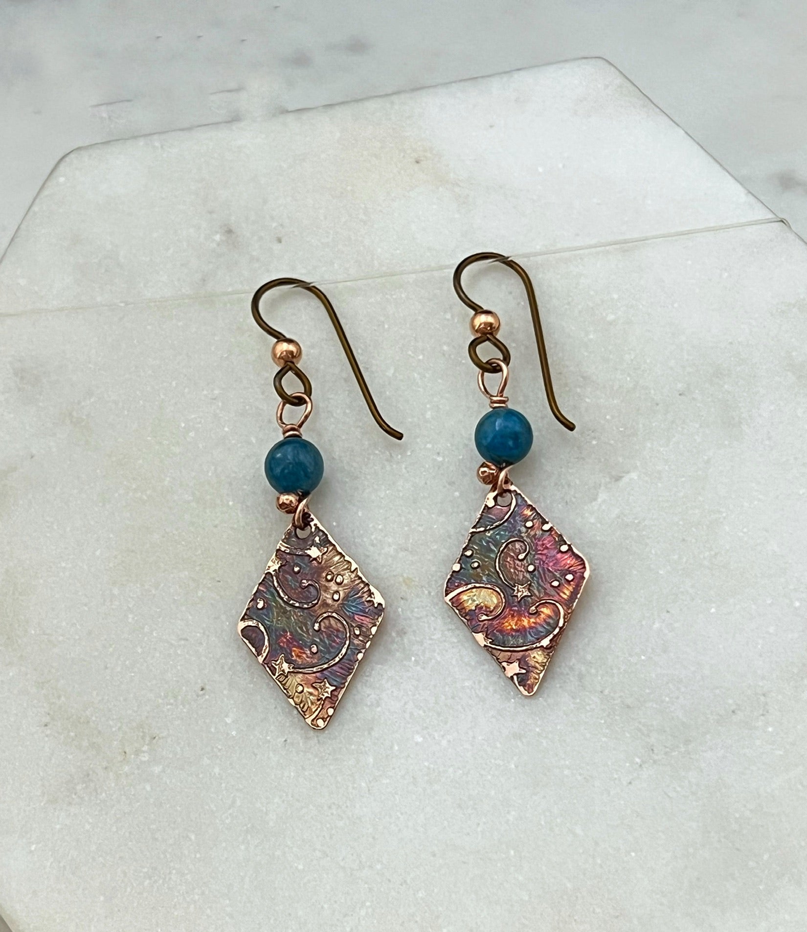 Acid etched copper earrings with apatite gemstones. These earrings have been hand cut and etched then colored with a chemical patina and sealed to protect against tarnish. Earrings are half an inch wide by 1.2 inches long. Ear wires are hypoallergenic niobium metal.