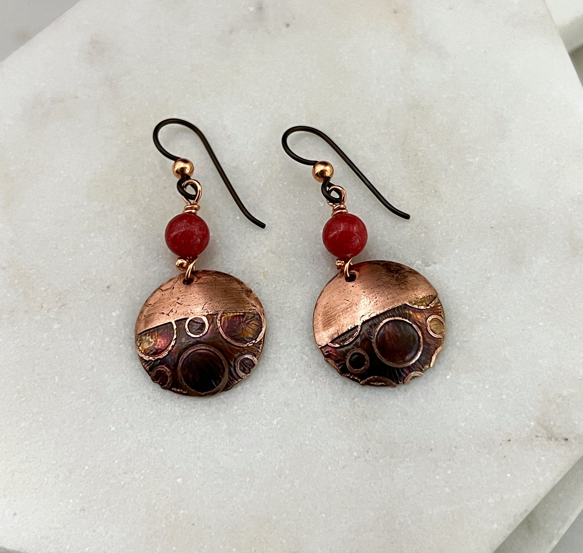 Acid etched copper earrings with coral gemstones. These earrings have been hand cut and etched then colored with a chemical patina and sealed to protect against tarnish. Earrings are .75 an inch wide by 1.25 inches long. Ear wires are hypoallergenic niobium metal.