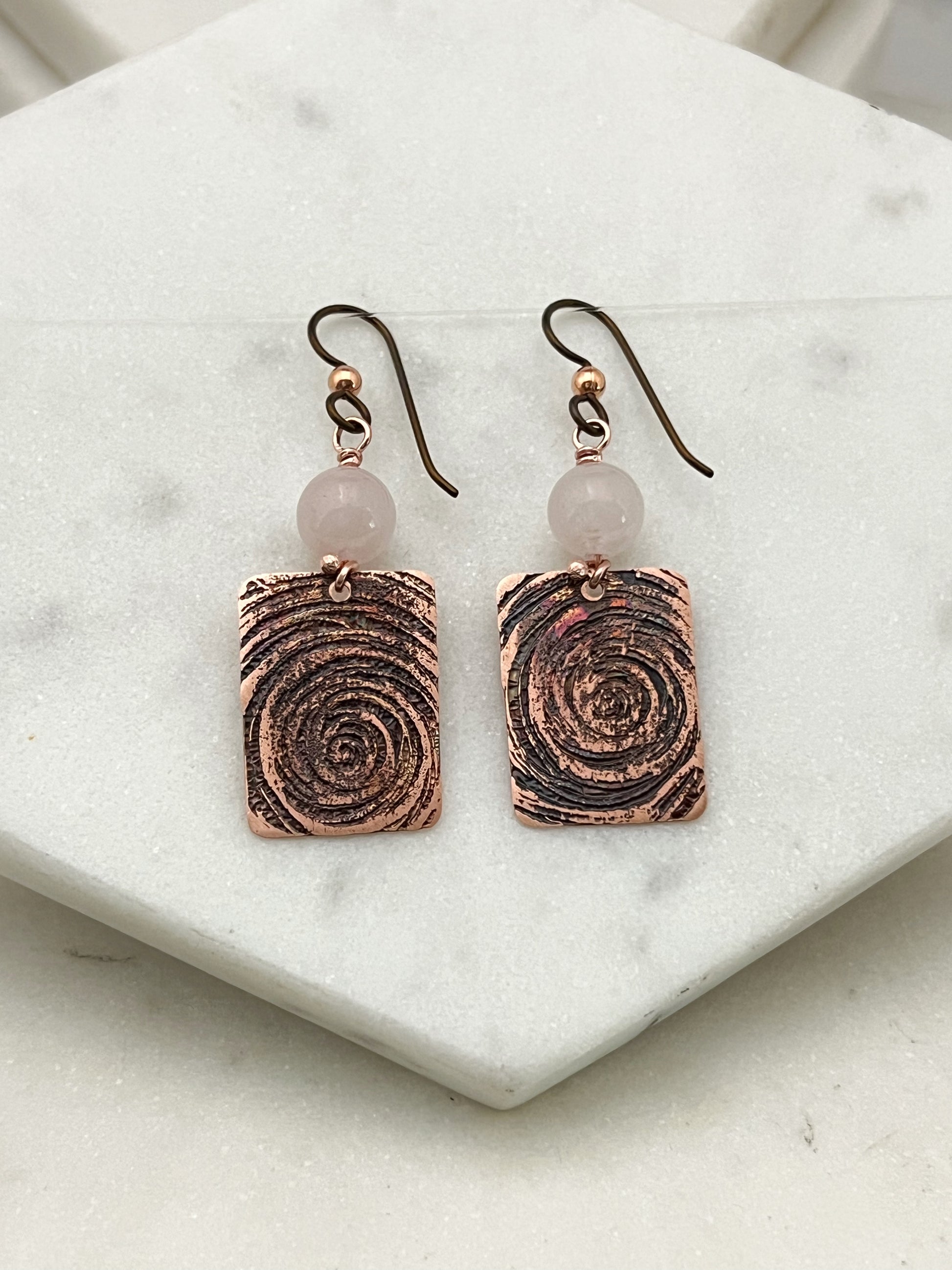 Acid etched copper earrings with rose quartz gemstones. These earrings have been hand cut and etched then colored with a chemical patina and sealed to protect against tarnish. They are .75 an inch wide by 1.5 inches long. Ear wires are hypoallergenic niobium metal.