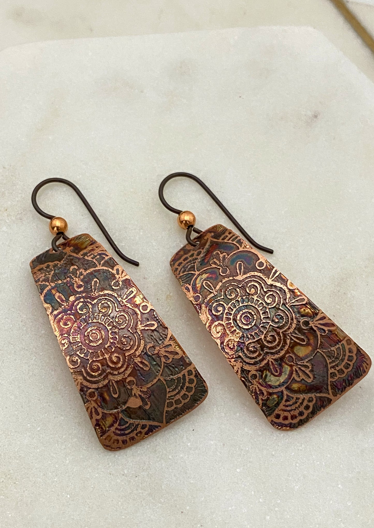 Acid etched copper irregular rectangle earrings. Colored with chemical patina and sealed to prevent tarnish. Ear wires are made from hypoallergenic Niobium metal. Earrings are just over 1.5 long by 0.75 wide