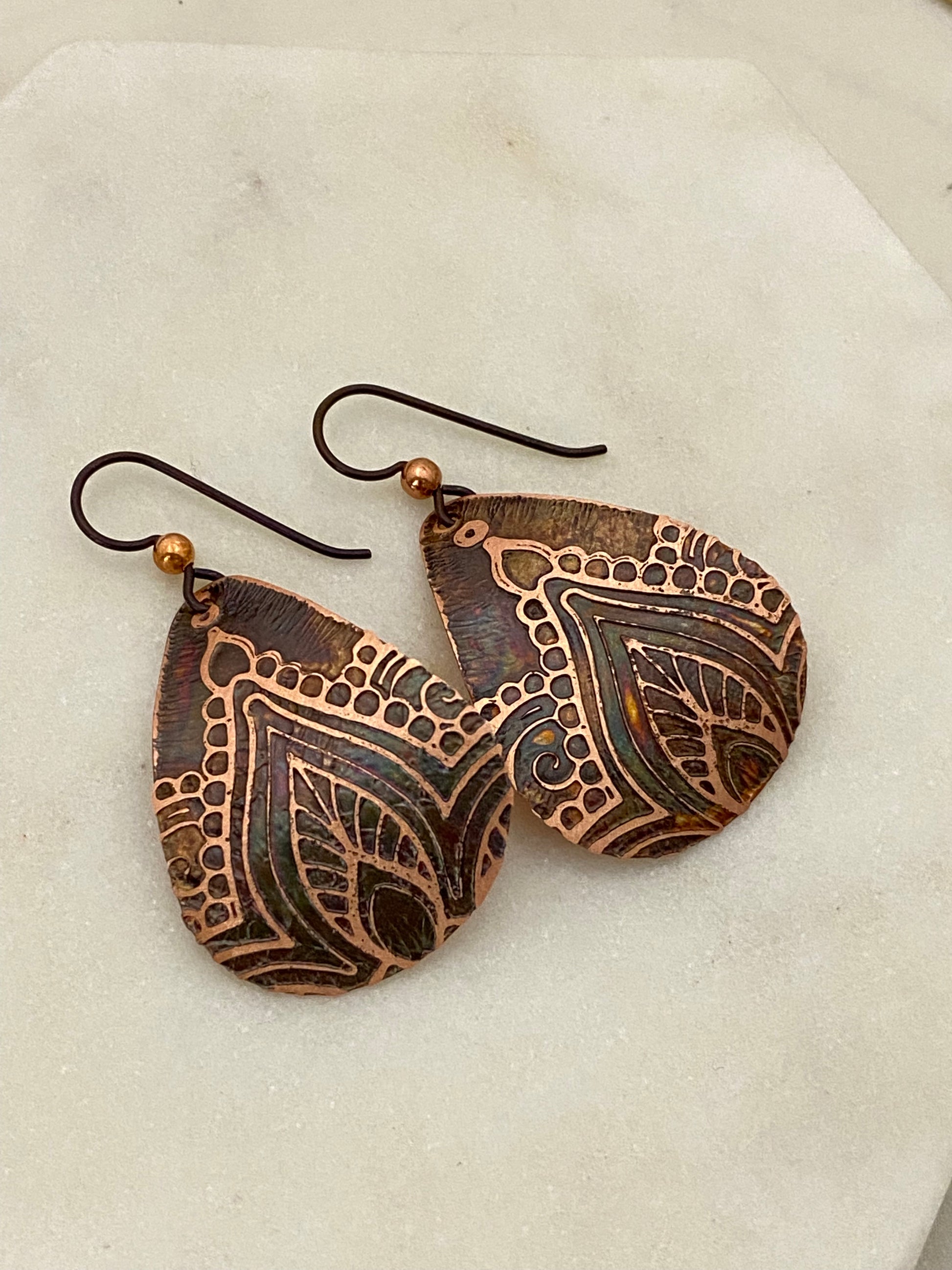 Acid etched copper medium teardrop earrings. Colored with a chemical patina and sealed to prevent tarnish. Ear wires are made from hypoallergenic Niobium metal. Earrings are just over 1 inch long by 1 inch wide.