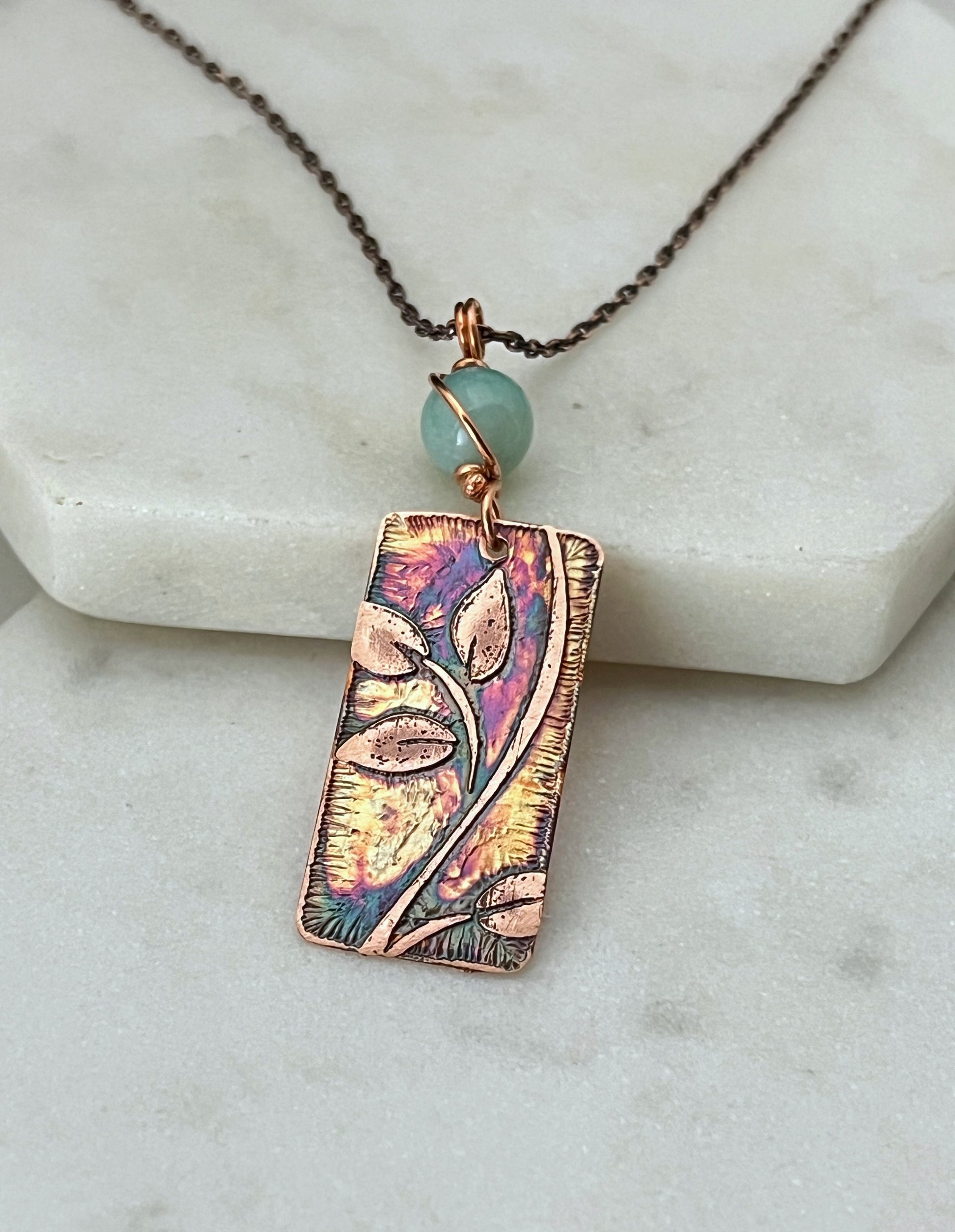 Acid etched copper necklace with amazonite gemstone. Pendent is .75 of an inch wide and 2 inches long. Necklace has been colored with a chemical patina and sealed to protect against tarnish. Chain is adjustable 16-18 inches. Additional chain length available upon request