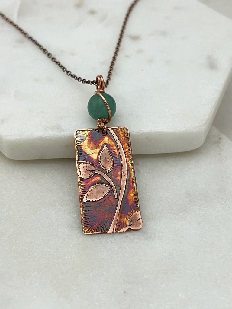 Acid etched copper necklace with aventurine gemstone. Pendent is .75 of an inch wide and just under 2 inches long. Necklace has been colored with a chemical patina and sealed to protect against tarnish. Chain is adjustable 16-18 inches. Additional chain length available upon request