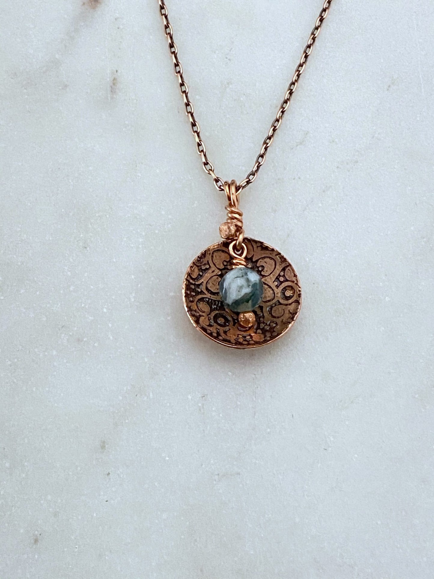 Handmade acid etched copper necklace with moss agate gemstones. Colored with a chemical patina and sealed to prevent tarnish. This pendent is just over half an inch round. The chain is copper and adjustable from 16-18 inches.