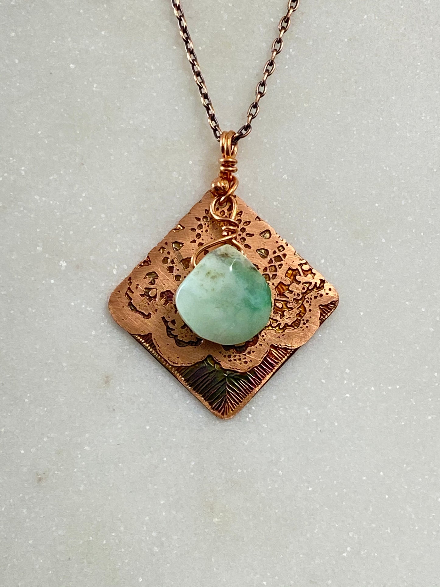 Handmade acid etched copper necklace with chrysoprase gemstone. Colored with chemical patina and sealed to prevent tarnish. Chain is adjustable 16-18 inches. Pendent is 1.25 long by 1.25 inch wide.