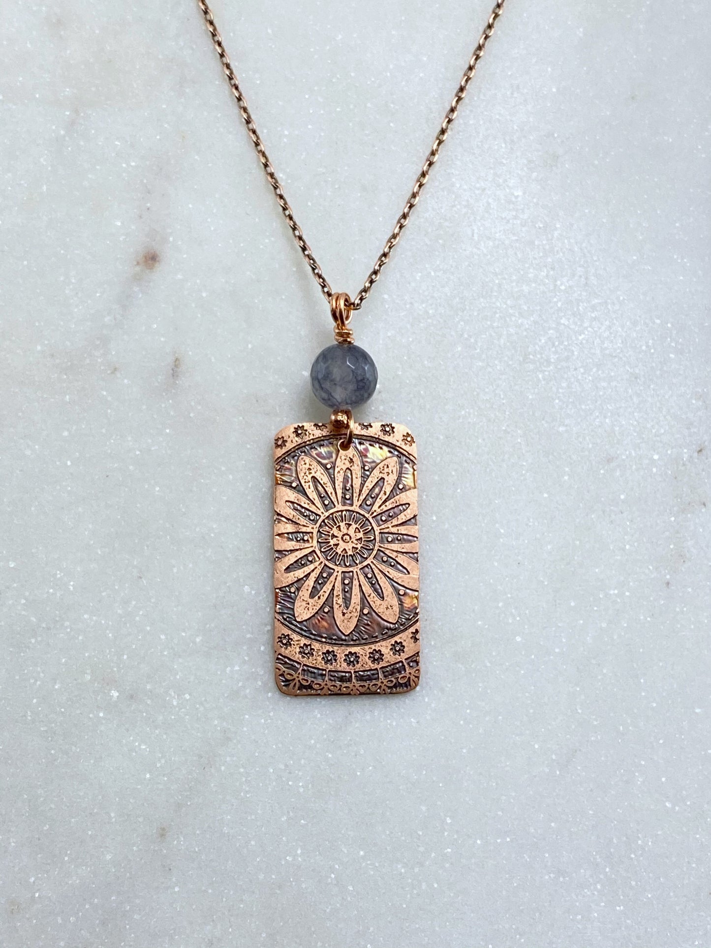 Acid etched copper necklace with quartz gemstone. Pendent is .75 wide and 2 inches long. Necklace has been colored with a chemical patina and sealed to protect against tarnish. Chain is adjustable 16-18 inches. Additional chain length available upon request