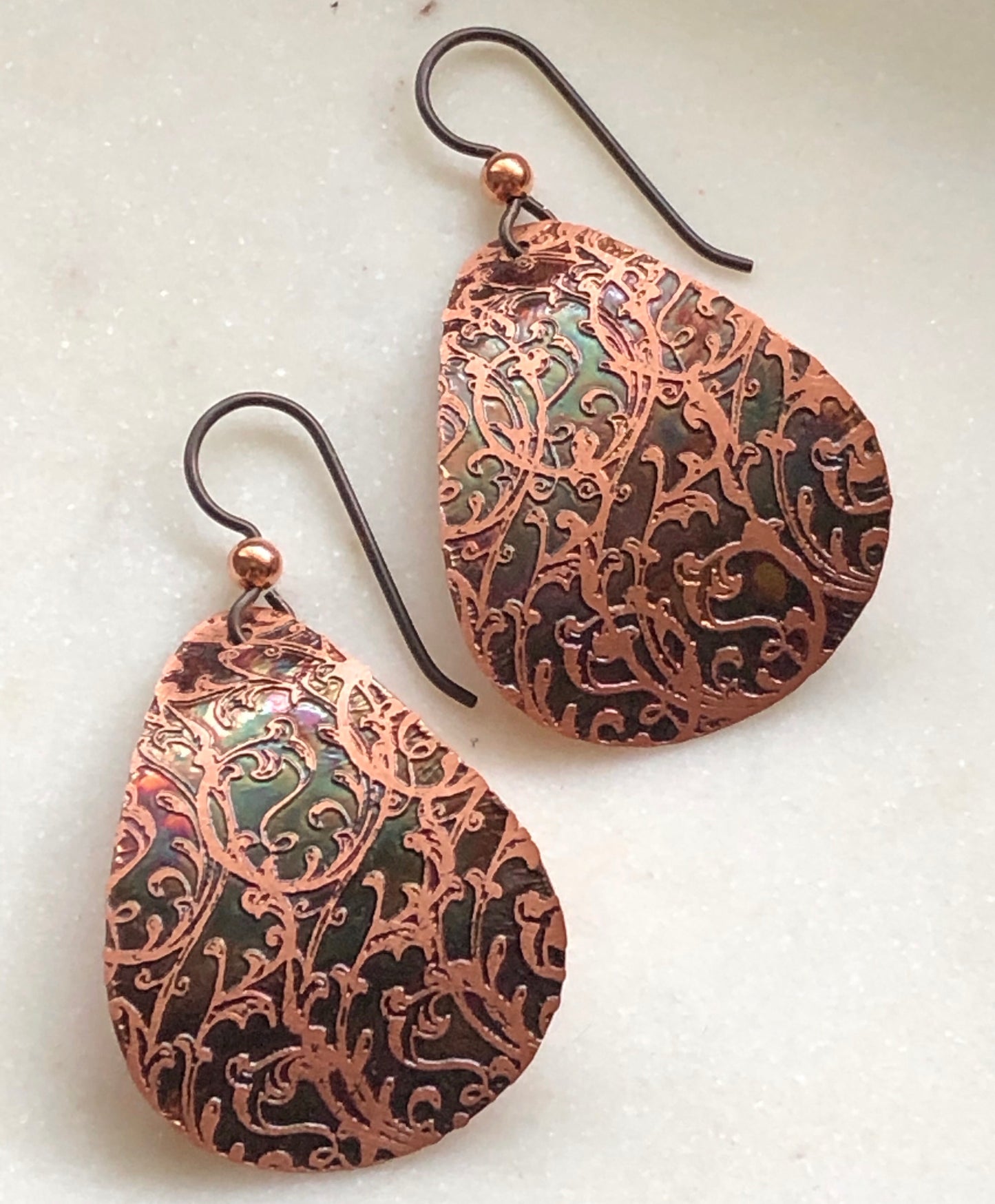 Acid etched copper medium tear drop earrings. Colored with chemical patina and sealed to prevent tarnish. Ear wires are made from hypoallergenic Niobium metal. Earrings are just over 1 inch long by 1 inch wide.