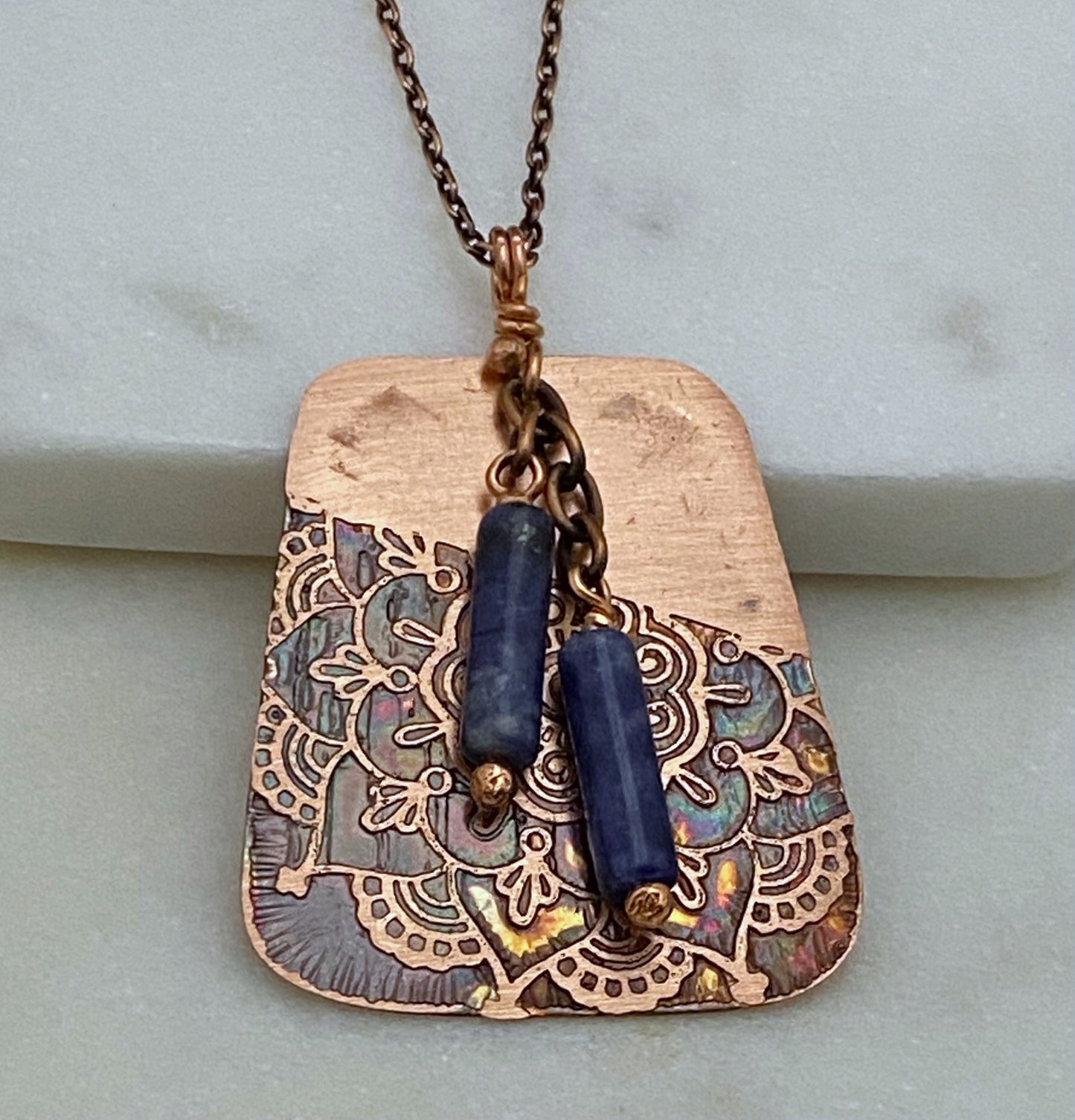 Acid etched copper necklace with sodalite gemstones. Pendent is just under 1.5 inches long by 1.25 inches wide. The copper has been colored with chemical patina and sealed to prevent tarnish. The chain is adjustable 16-18 inches.