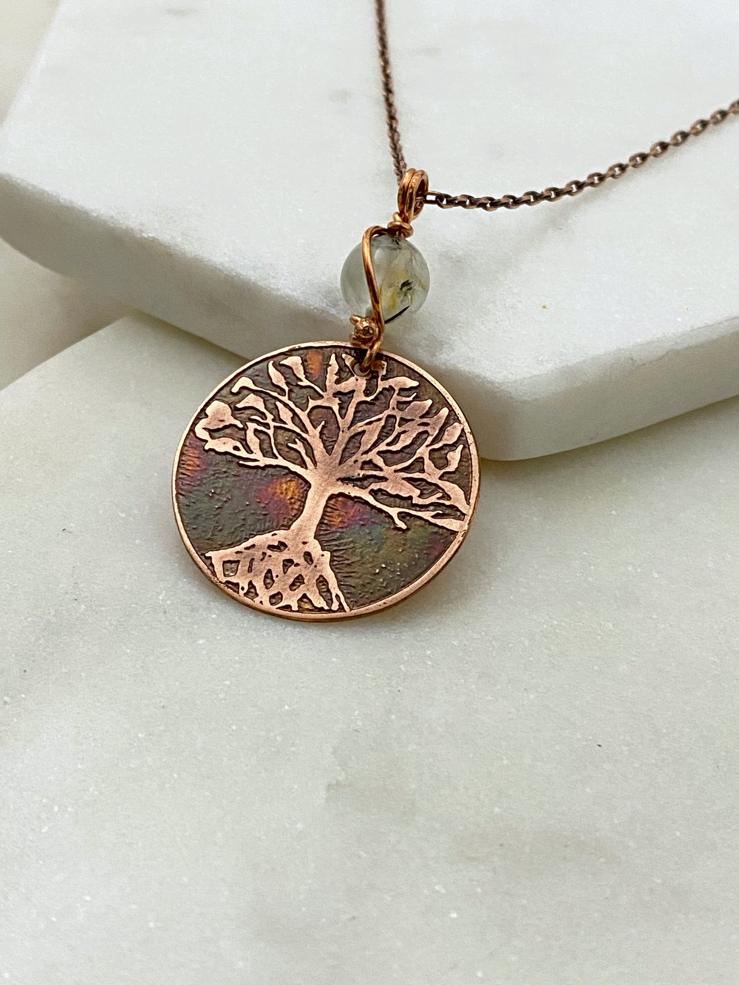 Acid etched copper tree necklace with prehnite gemstone. The pendent is 1 inch wide 1.5 inches long . The copper has been hand cut, etched and colored with chemical patina then sealed to prevent tarnish. The chain is adjustable 16-18 inches.