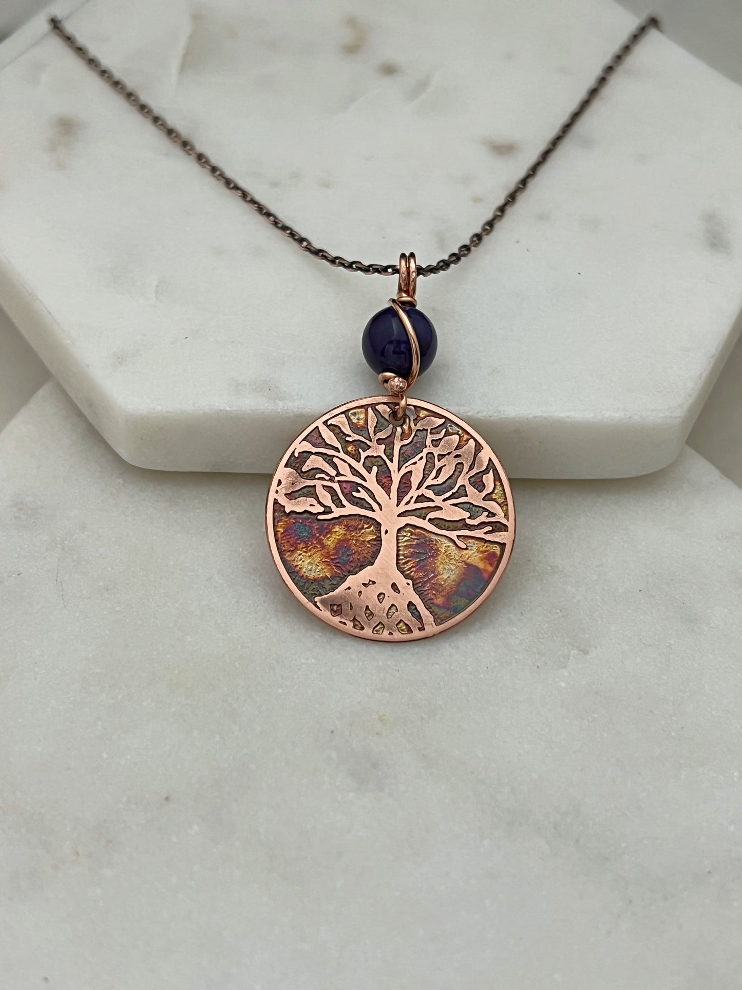 Acid etched copper tree necklace with sodalite gemstone. The pendent is 1 inch wide 1.5 inches long . The copper has been hand cut, etched and colored with chemical patina then sealed to prevent tarnish. The chain is adjustable 16-18 inches.