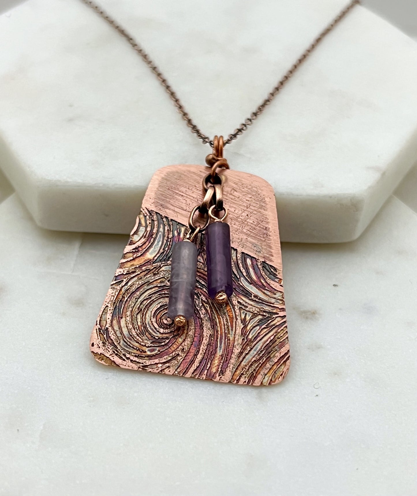 Acid etched copper necklace with amethyst gemstone. This pendent is 1.25 inches wide by just over 1.5 long. The design has been etched into the copper, colored with a chemical process and sealed to prevent tarnish. The chain is adjustable copper 16-18 inches.