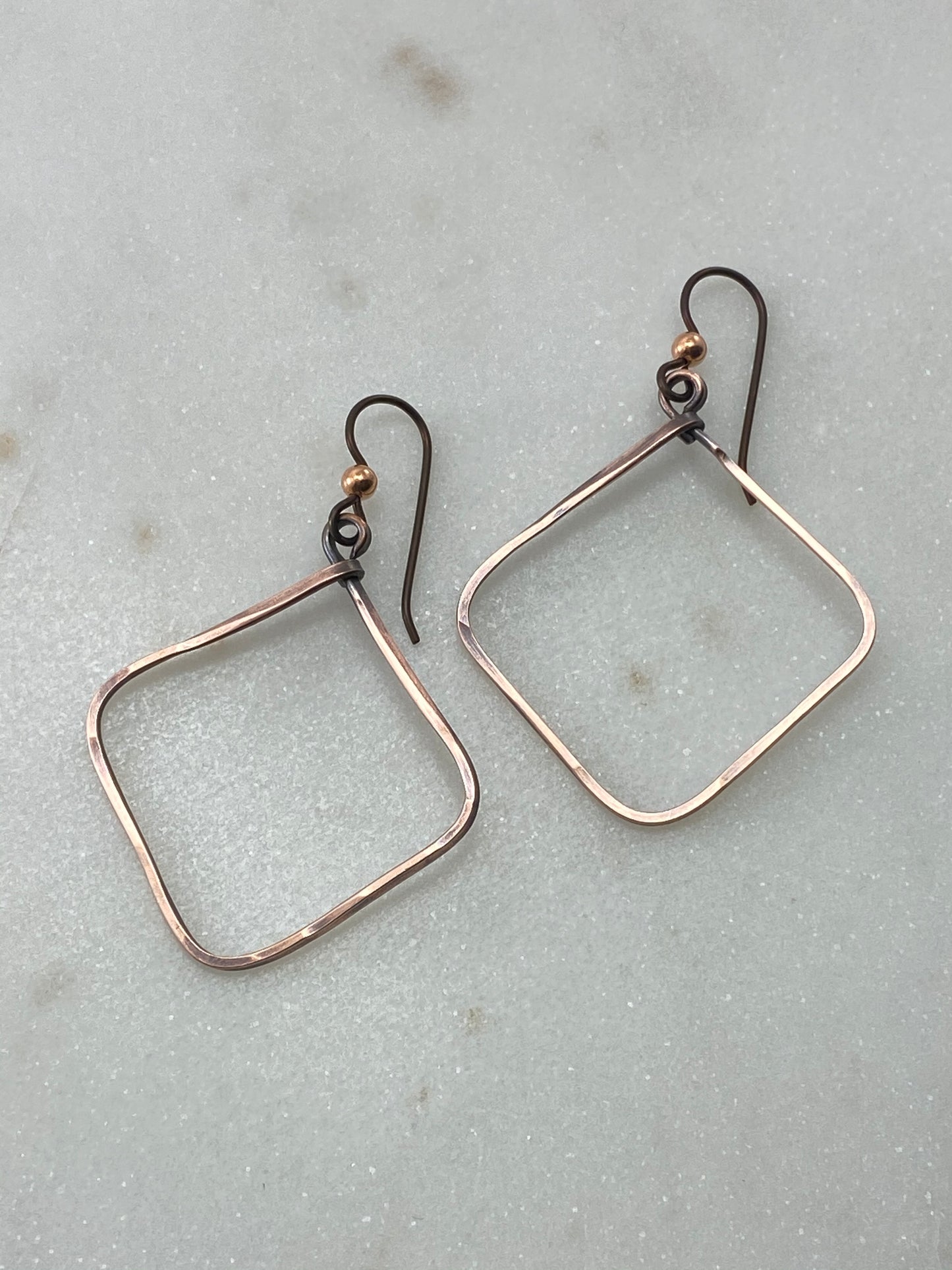 Square copper hoop earrings. Earrings are 1.5 inches wide and long. Earrings have been hammer textured and colored with a chemical patina. Ear wires are made of hypoallergenic niobium.