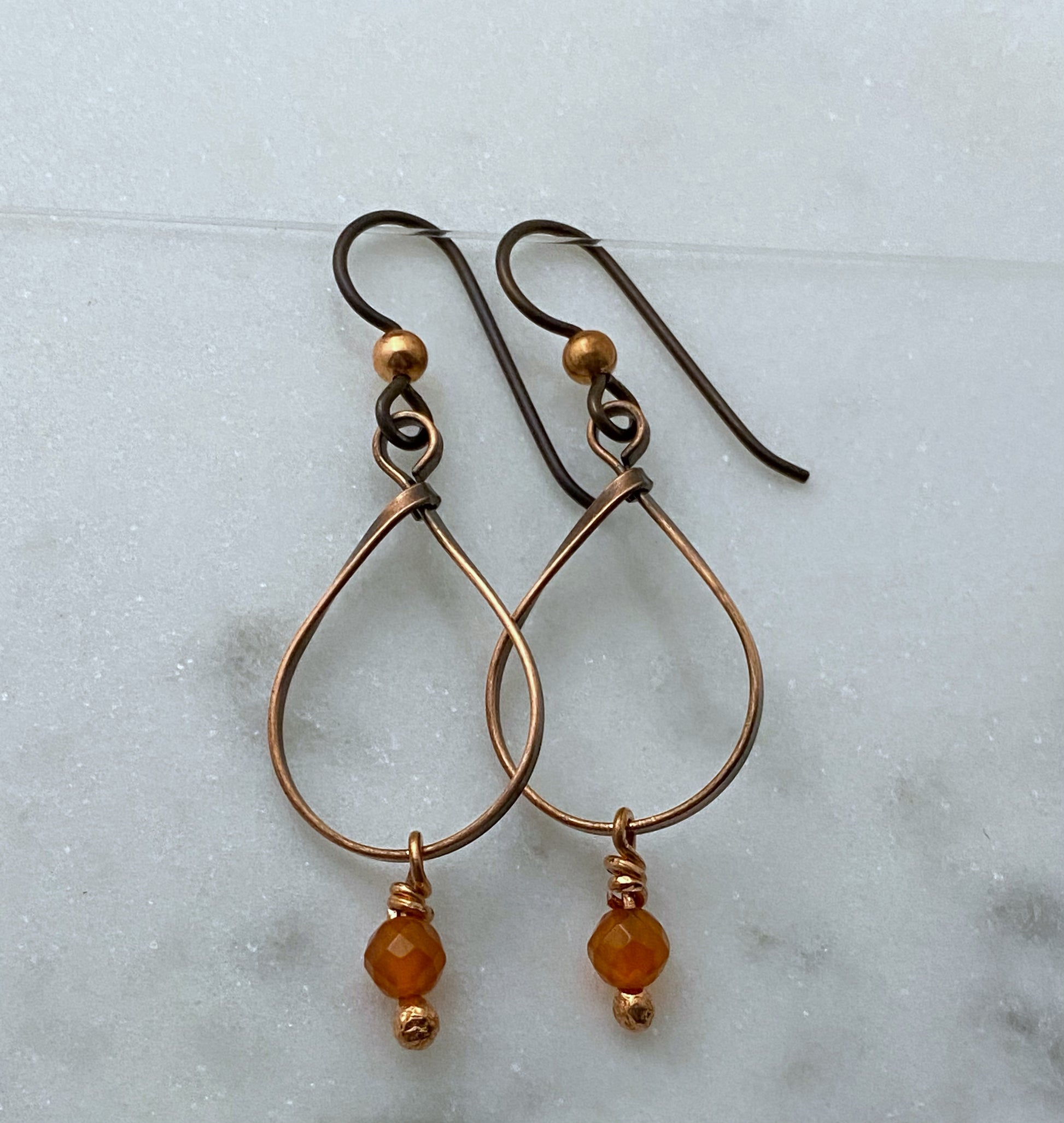 Copper teardrop earrings with carnelian