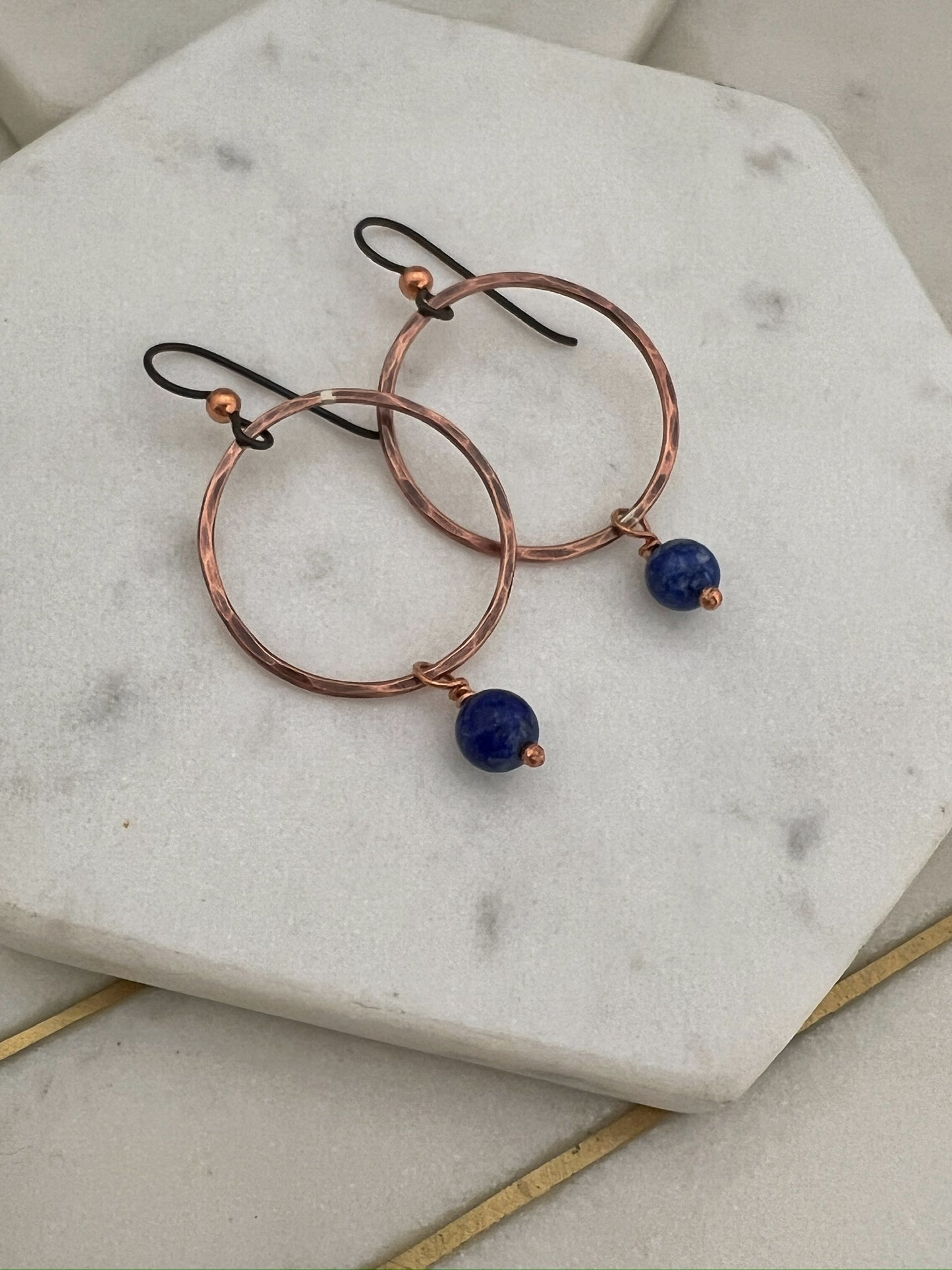 Handmade forged copper teardrop hoop earrings with lapis gemstones. These earrings are 1.5 inches long by an inch wide. They have been hammer textured and colored with a chemical patina then sealed to prevent tarnish. Ear wires are made from hypoallergenic Niobium metal.