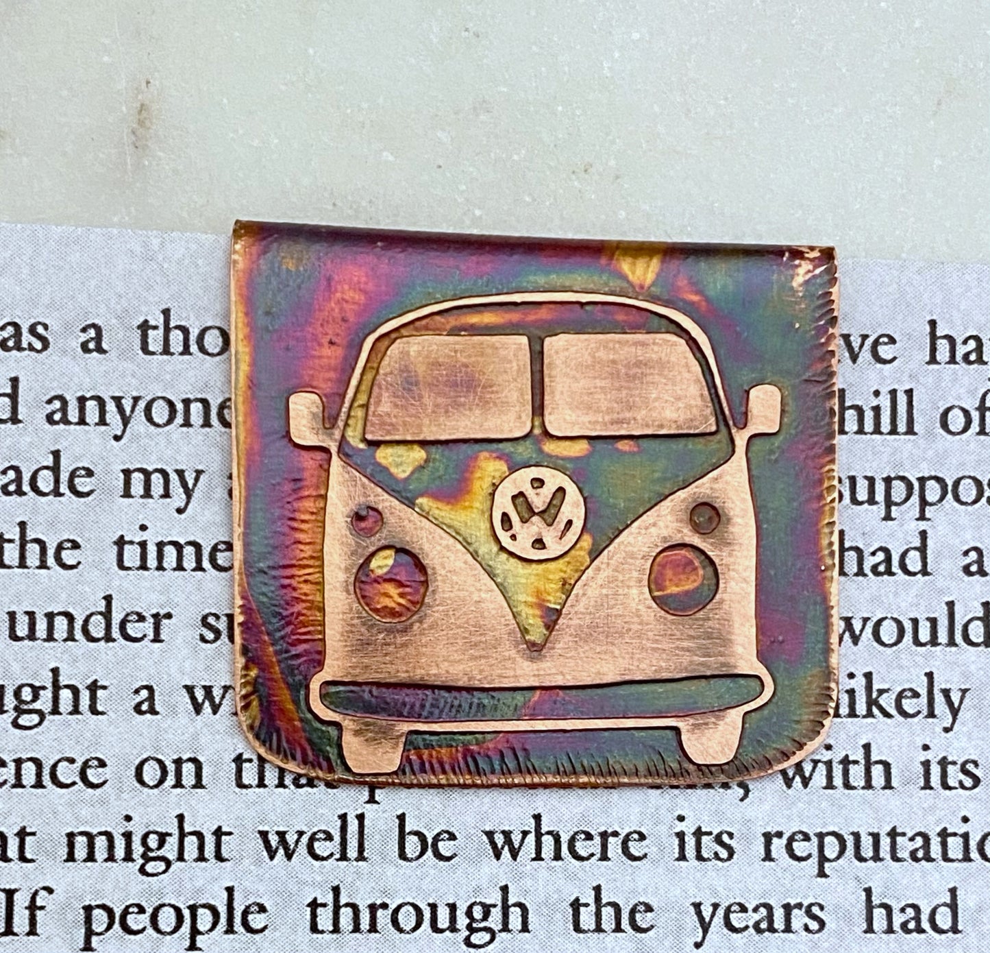 Acid etched VW bus bookmark. This bookmark folds over a few pages to secure it in place without damaging the book. It has been colored with a chemical patina and sealed to prevent tarnish.