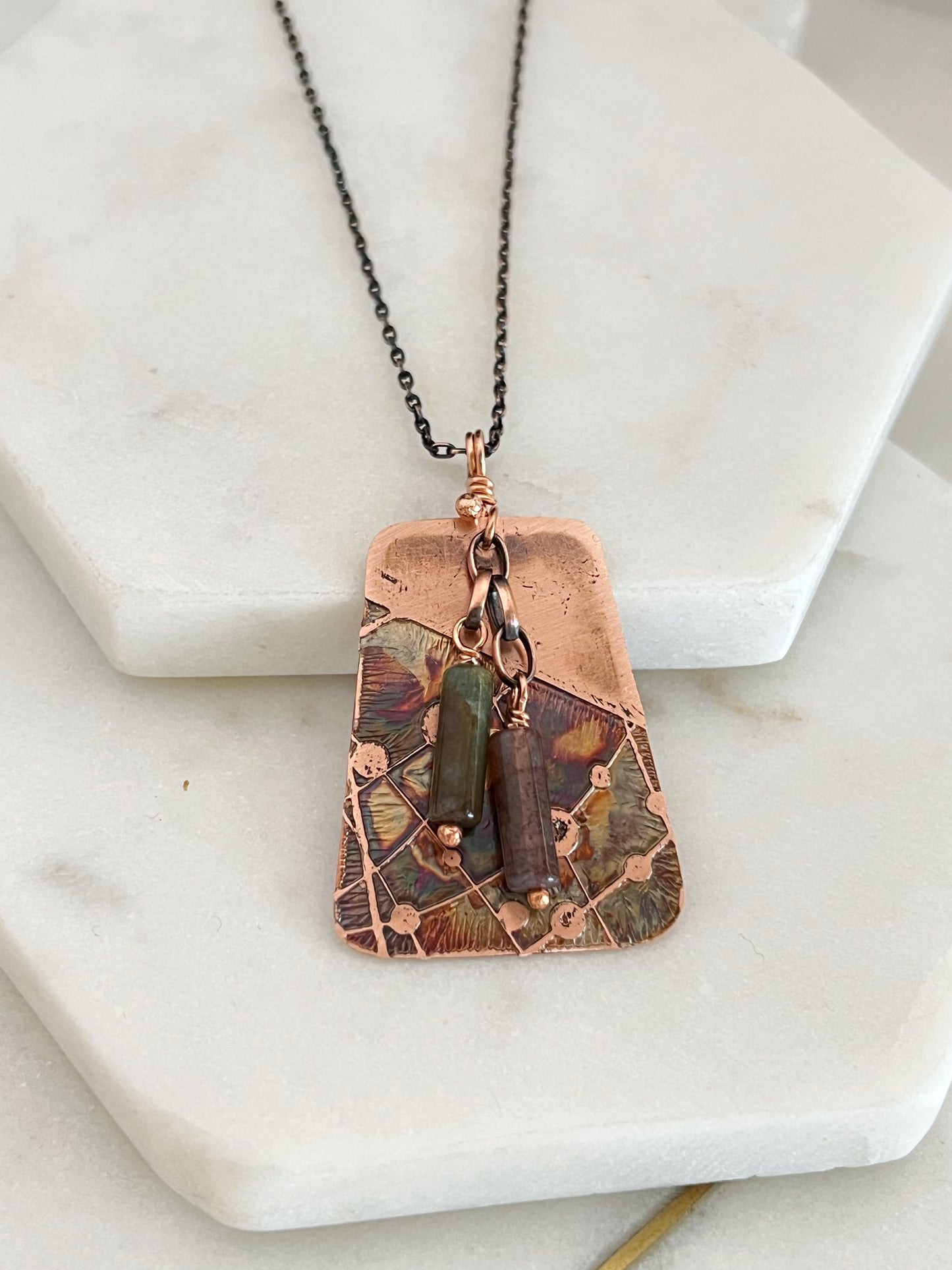 Acid etched copper necklace with bloodstone gemstones. Pendent is 1.5 inches long by just under 1.25 inches wide. The copper has been colored with chemical patina and sealed to prevent tarnish. The chain is adjustable 16-18 inches.