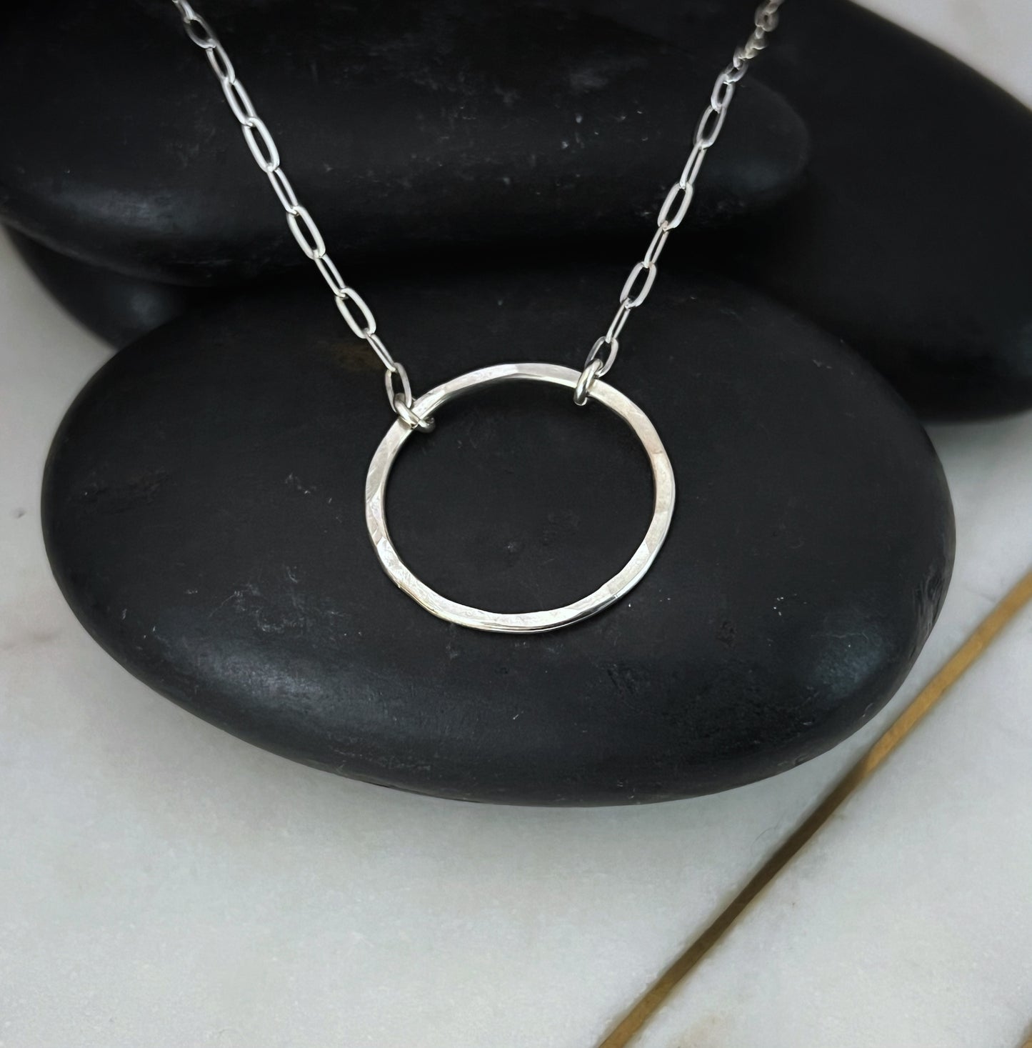 Hand forged sterling silver hoop necklace. The sterling hoop has been hammer textured and is 1 inch in diameter. The necklace including chain is sterling silver and 17.25 inches long.