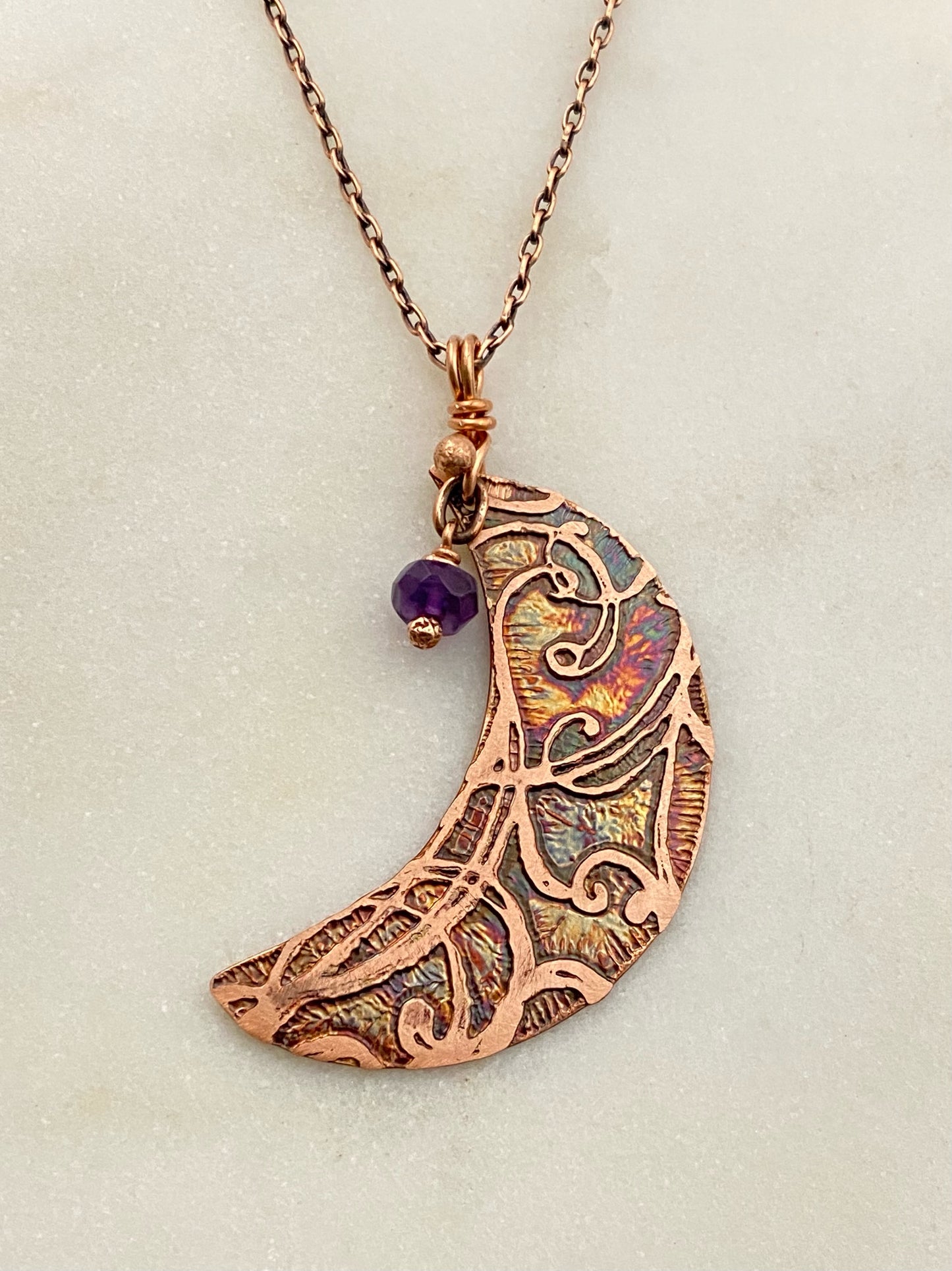 Crescent moon acid etched copper necklace with an amethyst gemstone