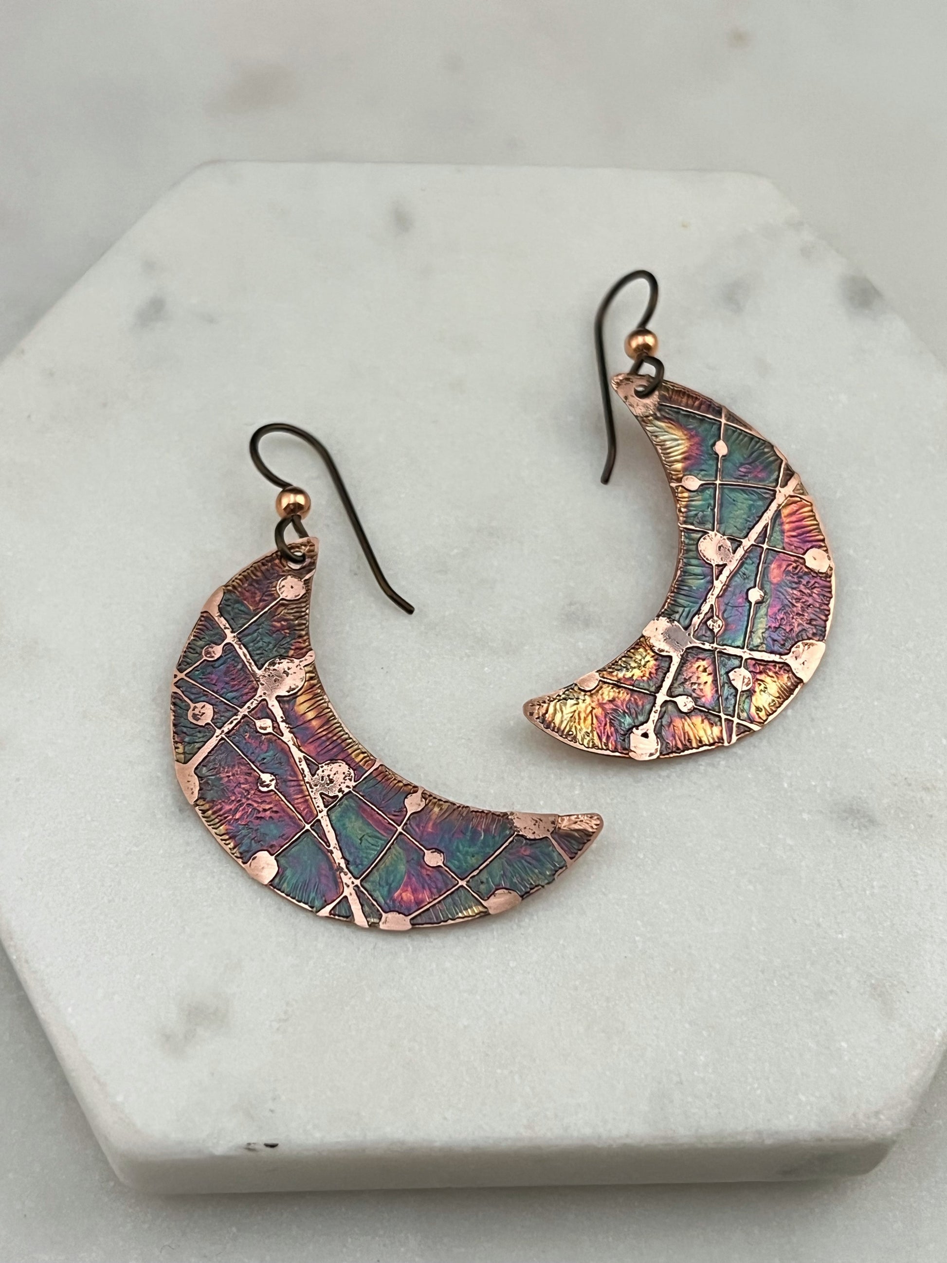 Acid etched copper crescent moon earrings. These earrings have been hand cut, colored with a chemical patina and sealed to prevent tarnish . Earrings are just over 0.5 wide by 1.5 inches long. Ear wires are made from hypoallergenic Niobium metal.