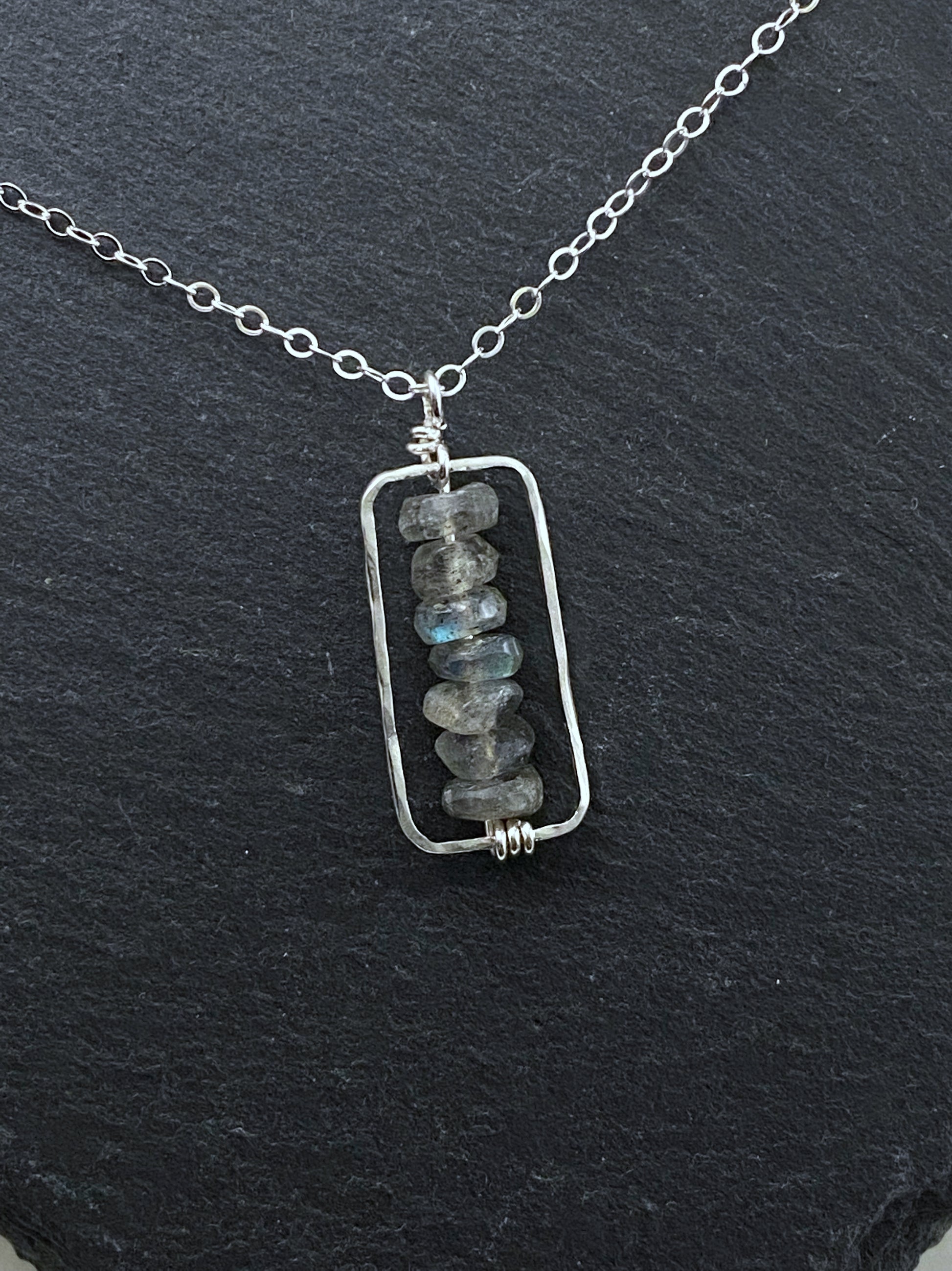 Forged sterling silver necklace with labradorite gemstone. This unique minimalist pendent is just under 1 inch long by half an inch wide. The chain is adjustable 16-18 inches.