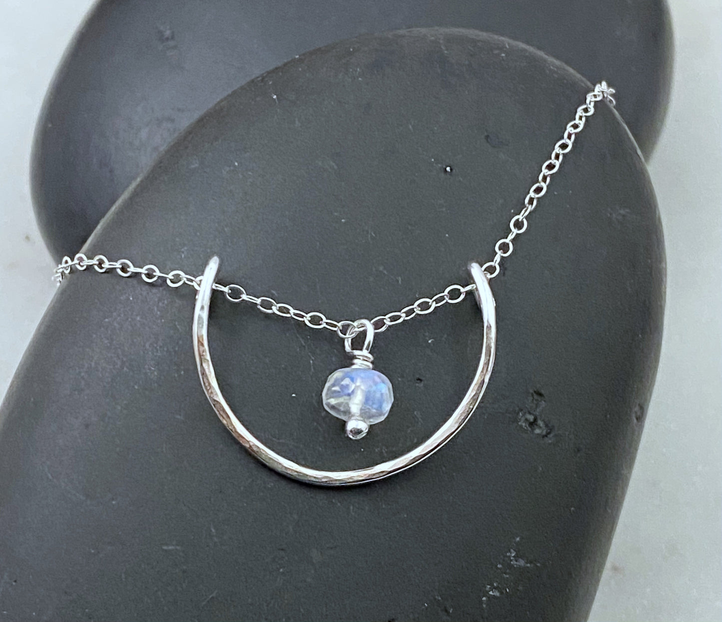 Forged sterling silver wire half moon necklace with rainbow moonstone. This pendent is an inch wide by just over .75 an inch long. The chain is sterling silver and adjustable 16-18 inches.