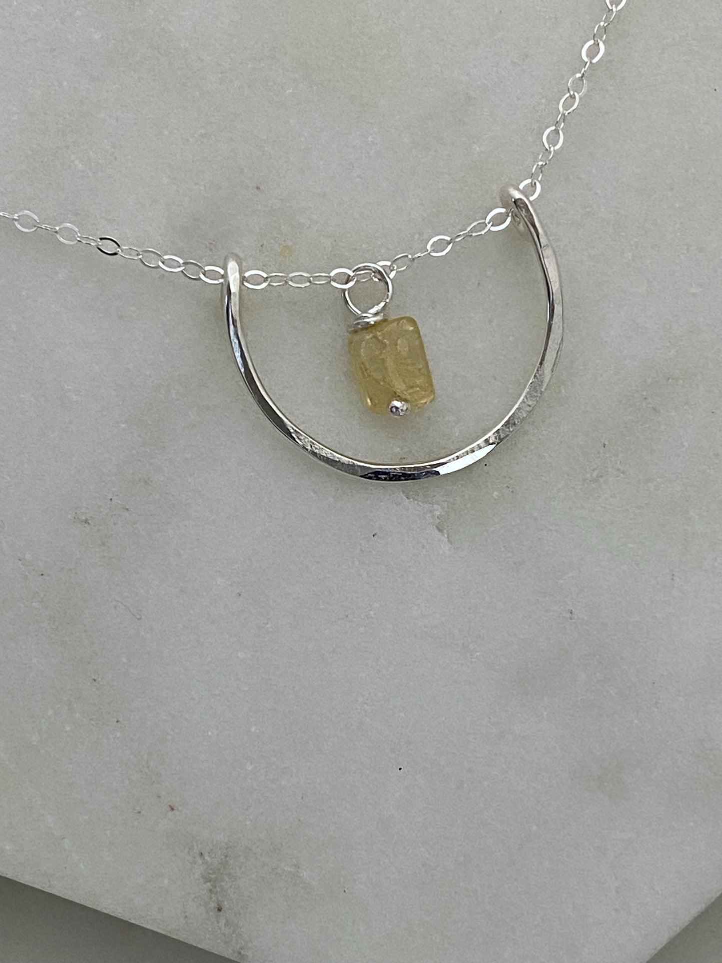 Forged sterling silver wire half moon necklace with citrine gemstone. This pendent is just under 1 inch wide by .75 an inch long. The chain is sterling silver and adjustable 16-18 inches.
