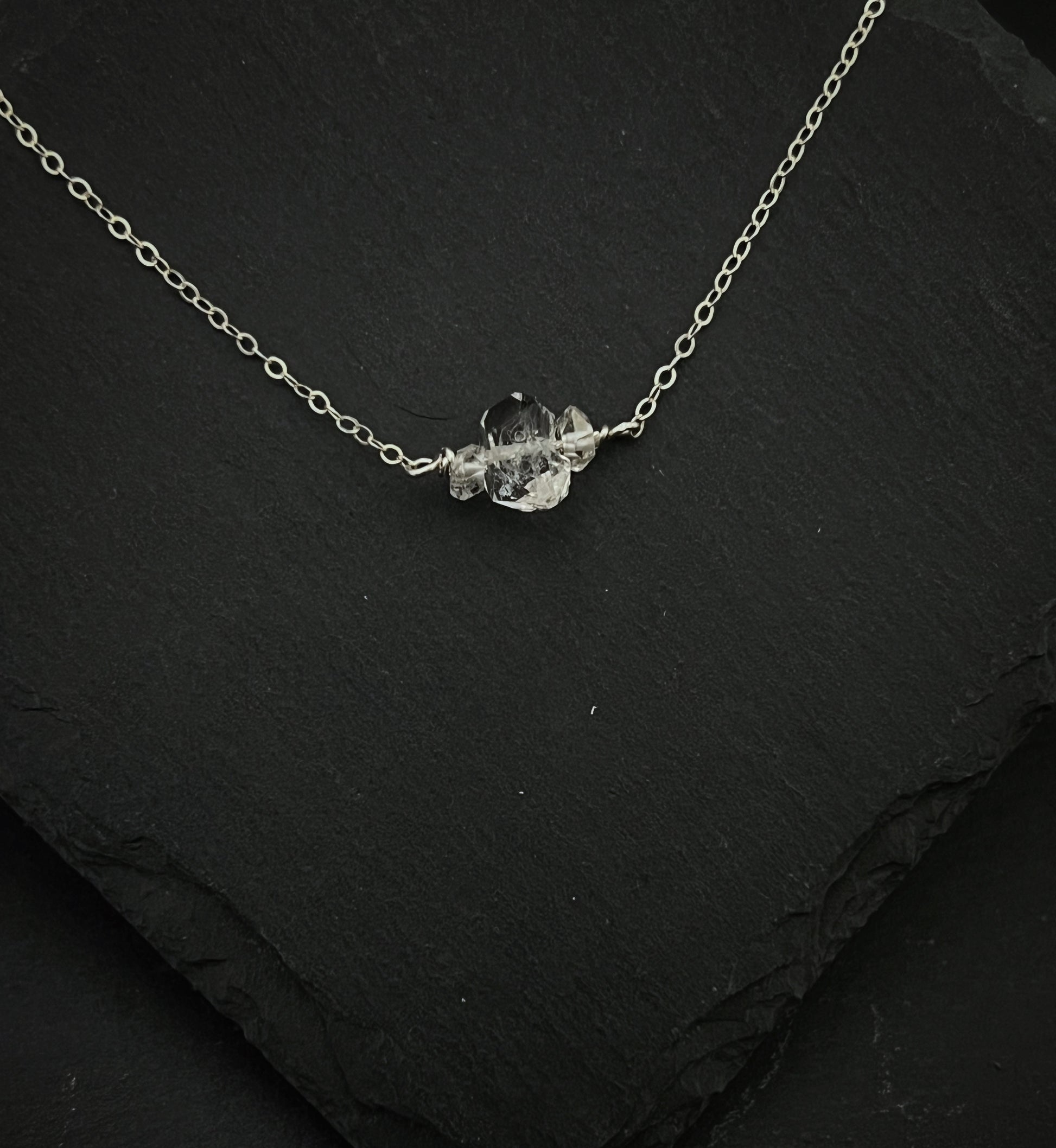 Herkimer Diamond and sterling silver simple necklace. 3 Herkimer Diamond gemstones have been wire wrapped into a sterling silver chain. This necklace is 17.75 inches long and is meant to be worn close around the neck.