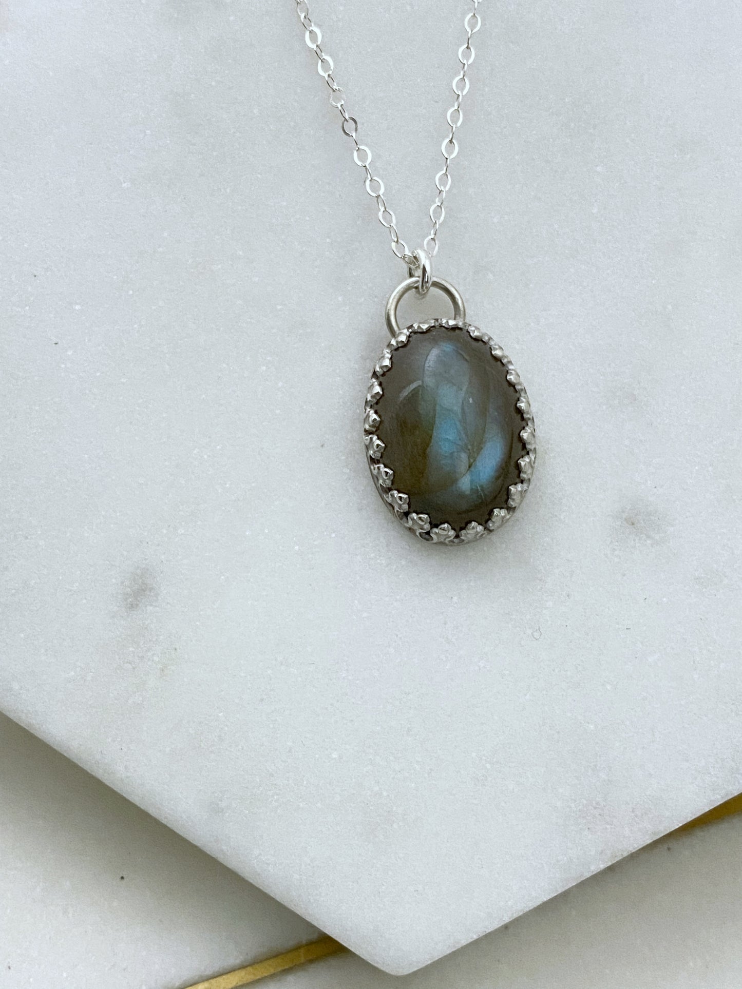 Sterling silver necklace with a stone set labradorite gemstone. This pendent is 1 inch long by just over .5 an inch wide. The chain is adjustable sterling silver 16-18 inches.