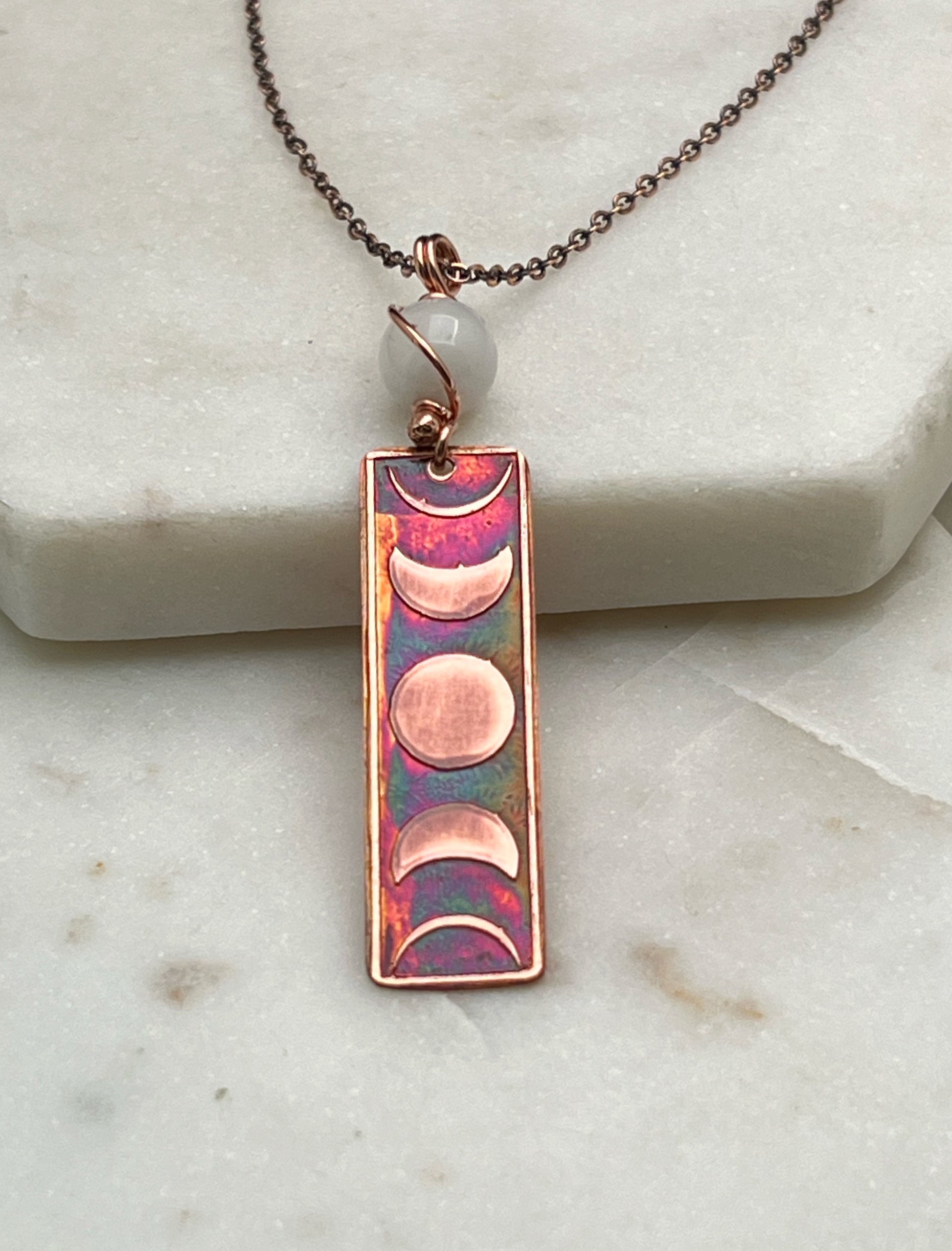 Handmade moon phase acid etched copper necklace with moonstone gemstone pendent with stone is 2 inches long by .5 wide. Suspended from a warm copper chain, this piece blends celestial symbolism with artisan craftsmanship. Each necklace is handmade, so color and patina will vary slightly, making every piece one-of-a-kind. The copper has been colored with chemical patina and sealed to prevent tarnish. The chain is adjustable 16-18 inches.