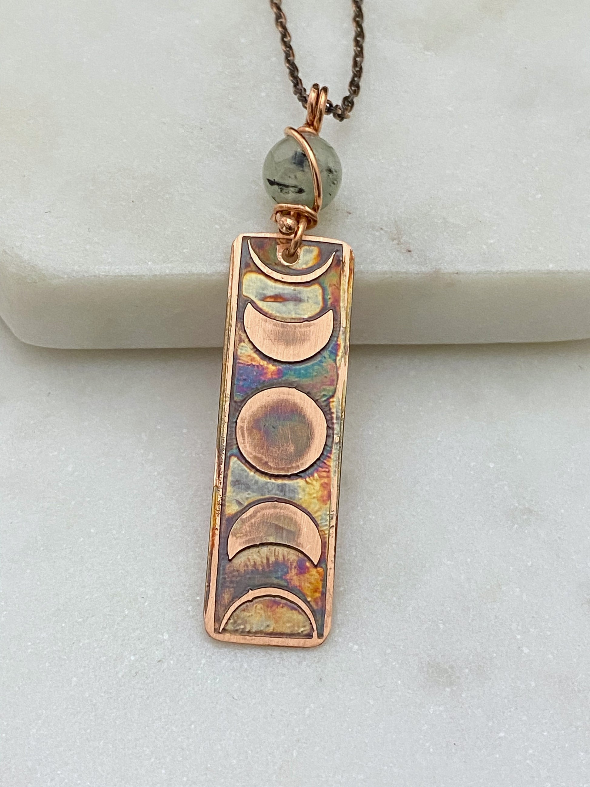 Handmade moon phase acid etched copper necklace with prehnite gemstone pendent with stone is 2 inches long by .5 wide. The copper has been colored with chemical patina and sealed to prevent tarnish. The chain is adjustable 16-18 inches.