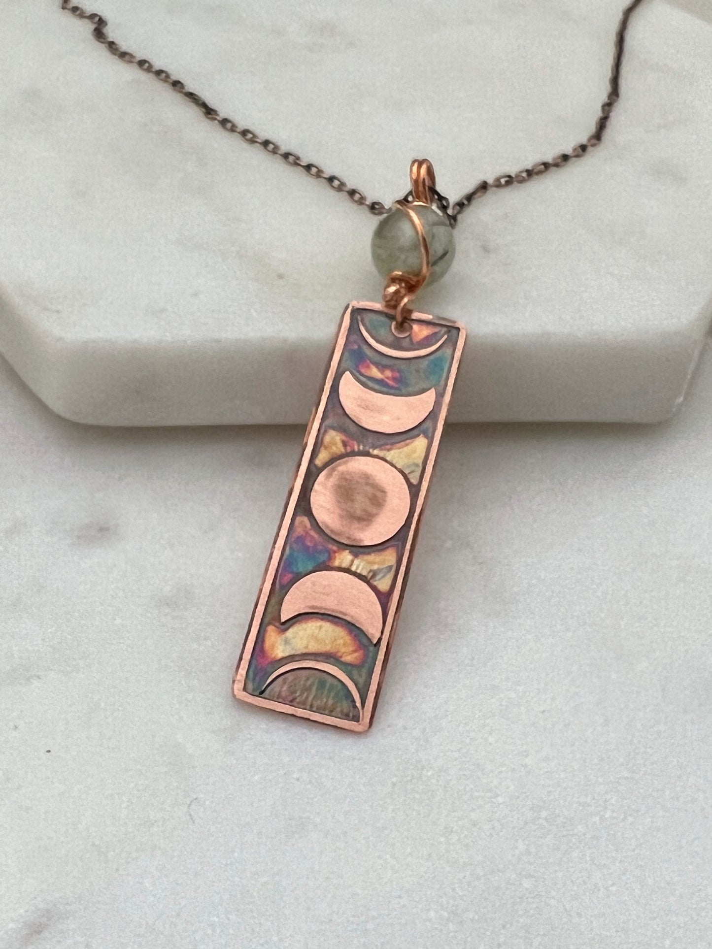 Handmade moon phase acid etched copper necklace with prehnite gemstone pendent with stone is 2 inches long by .5 wide. The copper has been colored with chemical patina and sealed to prevent tarnish. The chain is adjustable 16-18 inches.