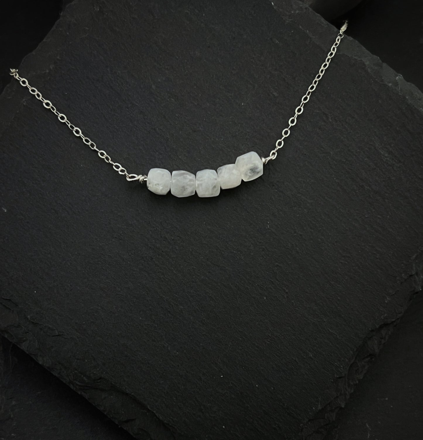 Rainbow moonstone gemstone and sterling silver curved necklace. Moonstone gemstones have been wire wrapped into a sterling silver chain. This necklace is 17.5 inches long and is meant to be worn close around the neck.