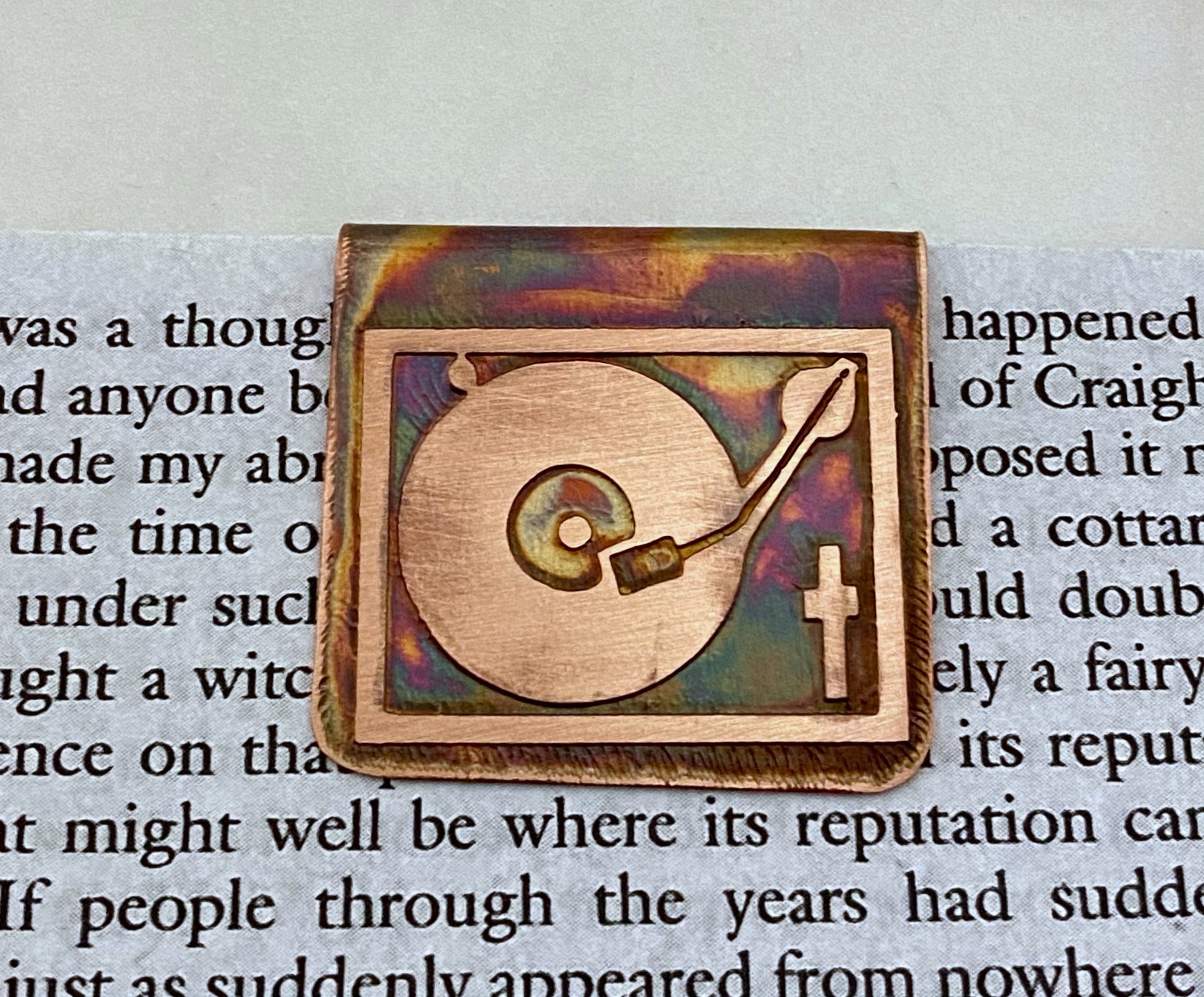 Acid etched copper record player bookmark. This bookmark folds over a few pages to secure it in place without damaging the book. It has been colored with a chemical patina and sealed to prevent tarnish.