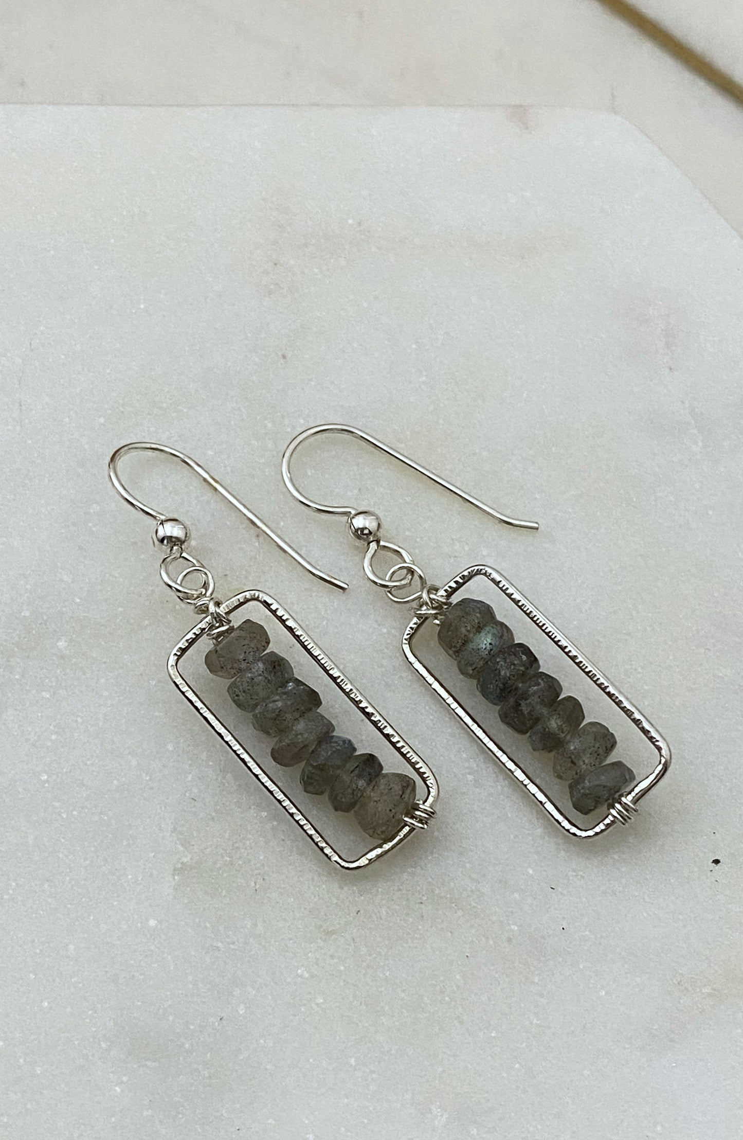 Forged sterling silver earrings with labradorite gemstone. These hoops have been hammer textured and are1 inch long by .5 an inch wide. The ear wires are sterling silver.