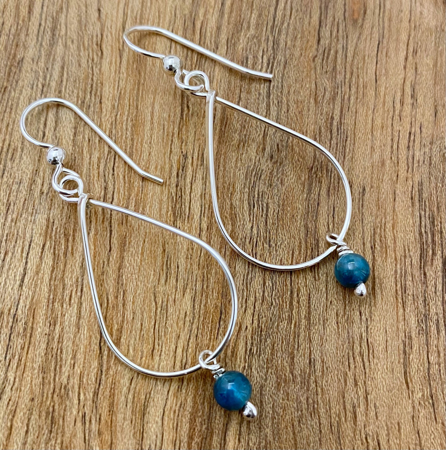 Sterling silver and apatite teardrop earrings. These lightweight earrings are 1.5 inches long by just under .75 inch wide. Ear wires are sterling silver