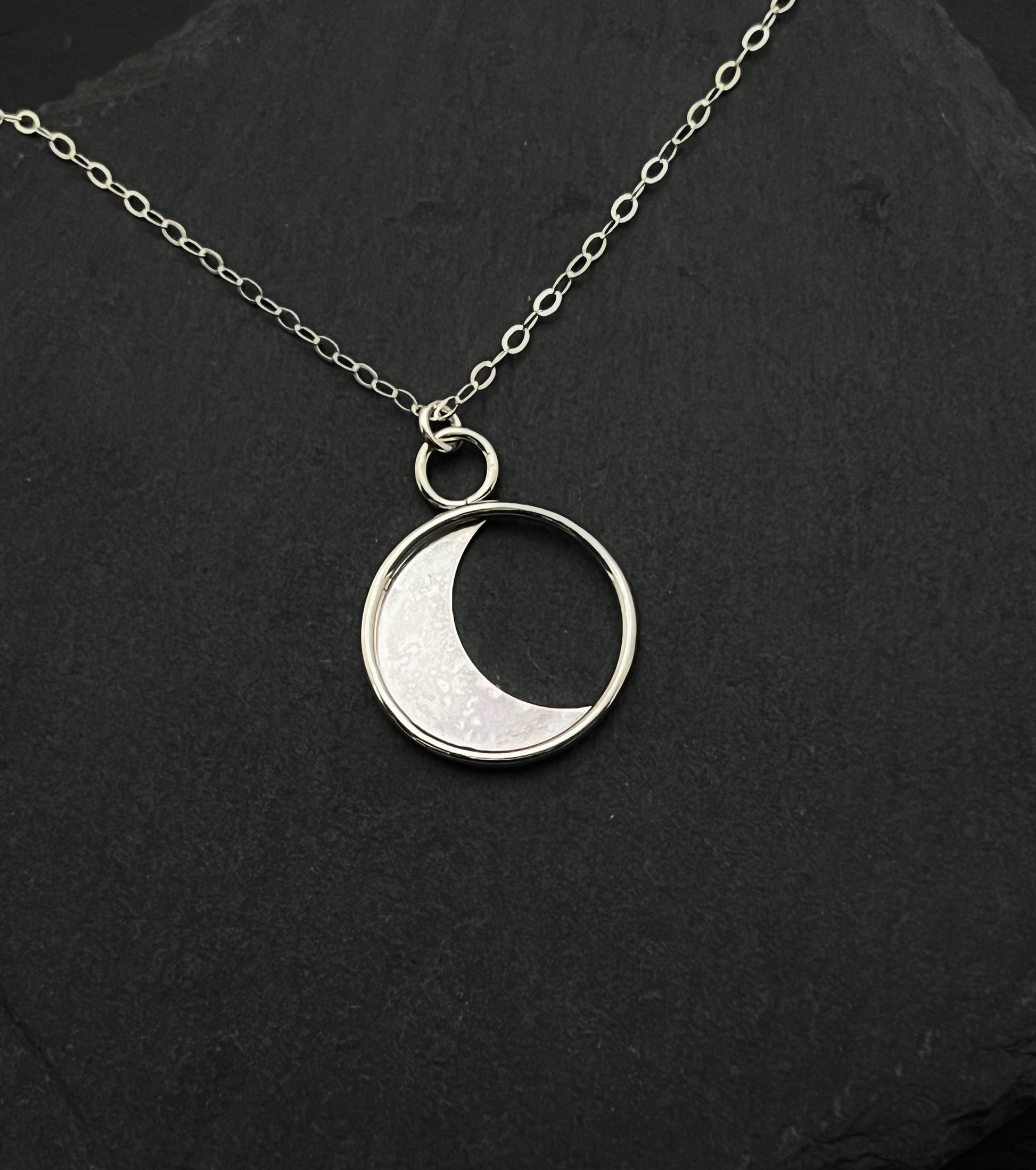 Inspired by lunar beauty, this handcrafted sterling silver necklace features a hammered crescent moon cradled in a polished circular frame. The subtle texture catches the light beautifully, while the open design adds a modern feel. Perfect worn alone or layered, it’s a versatile piece for any jewelry lover.