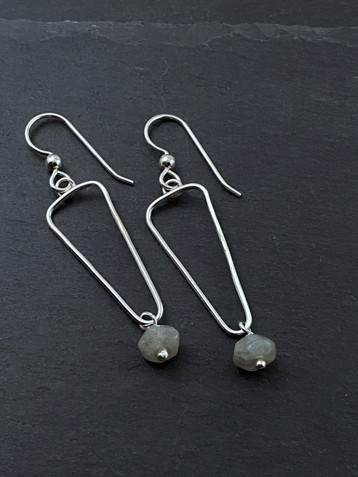 Forged sterling silver triangle earrings with labradorite gemstones wire wrapped at the end. Earrings are 1.5 in diameter by .5 wide. Ear wires are made of sterling silver.