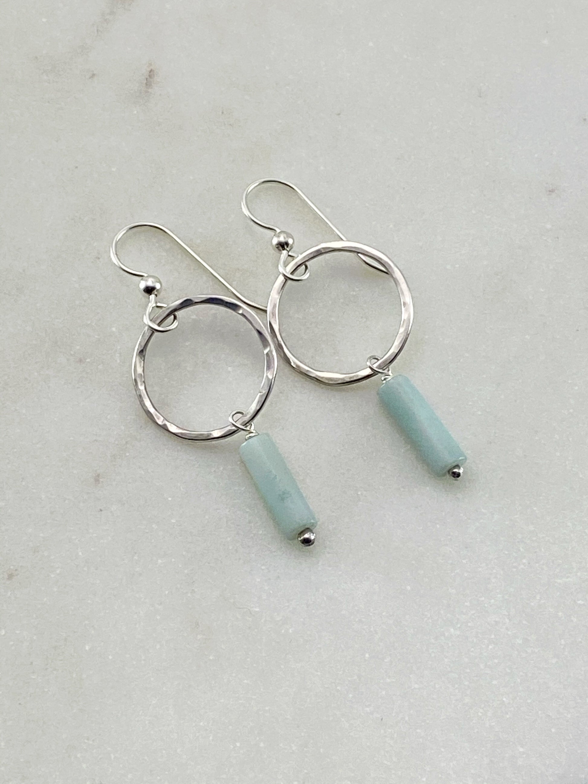 Sterling silver forged hoop earrings with amazonite tube gemstones