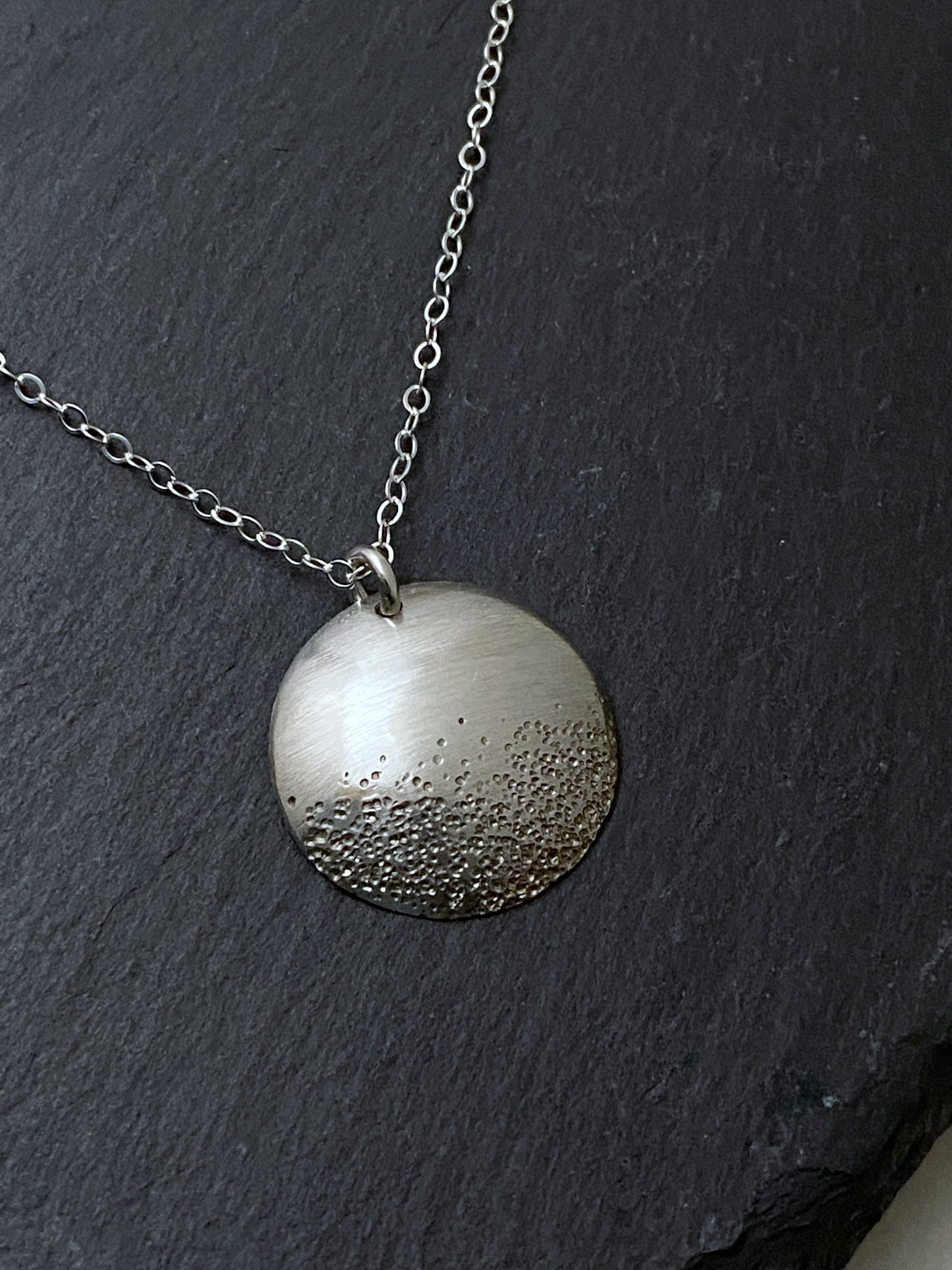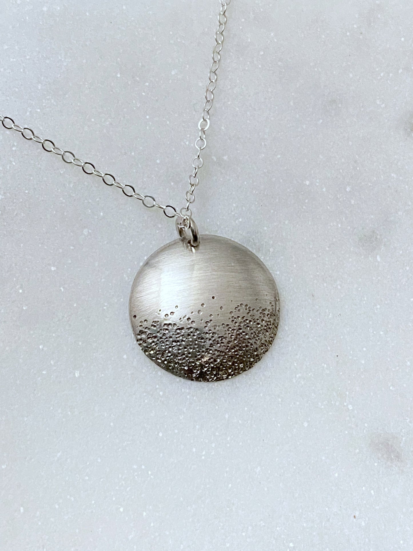 Sterling silver forged necklace. This pendent has been textured with a hammer and formed into a dish. Pendent is just under .75 in diameter. The chain is adjustable sterling silver from 16-18 inches. Additional chain length available upon request.