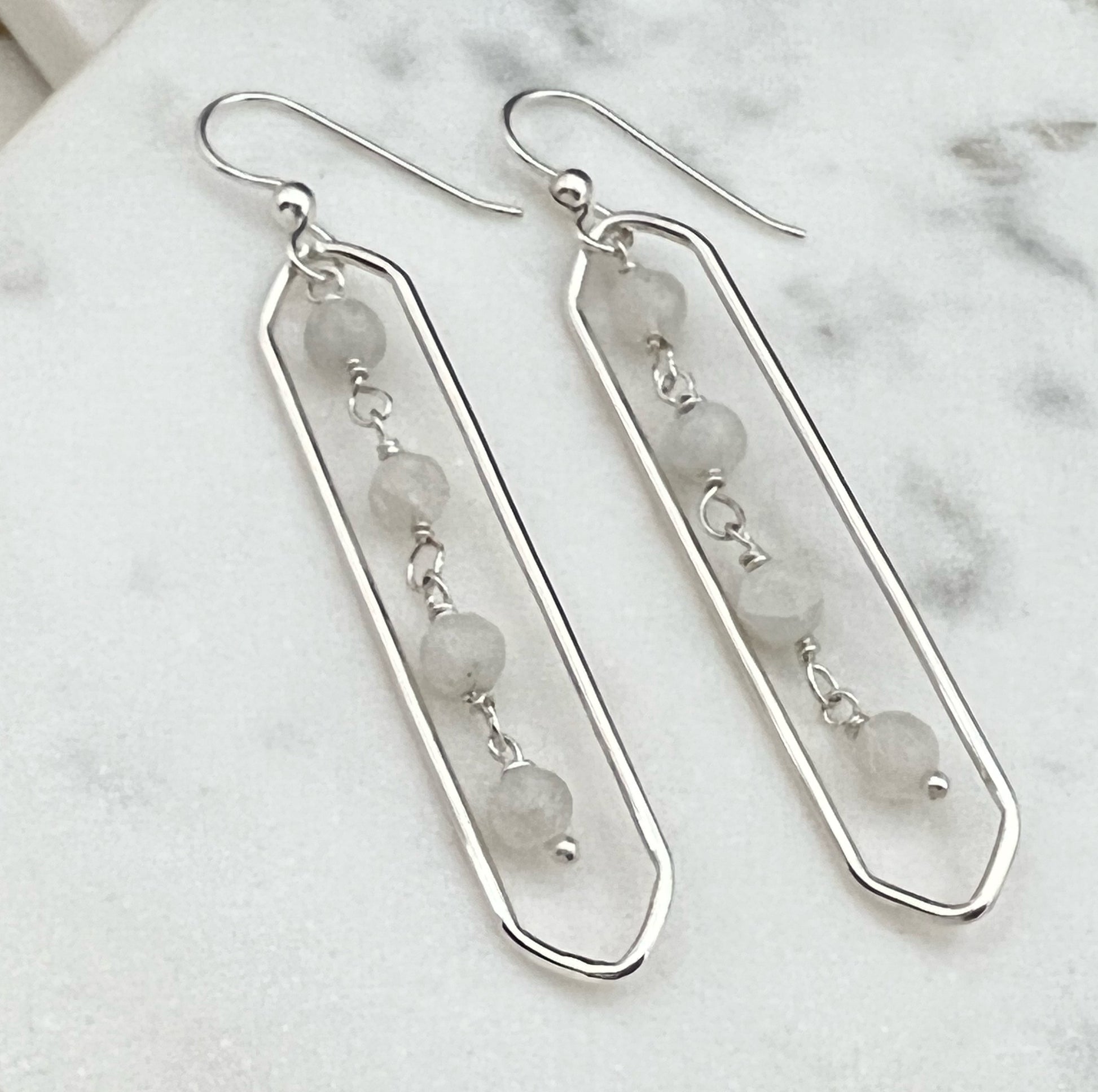 Sterling silver forged oval hoops with a moonstone chain wire wrapped through the center. These earrings are 2 inches long by .5 an inch wide. The ear wires are sterling silver.