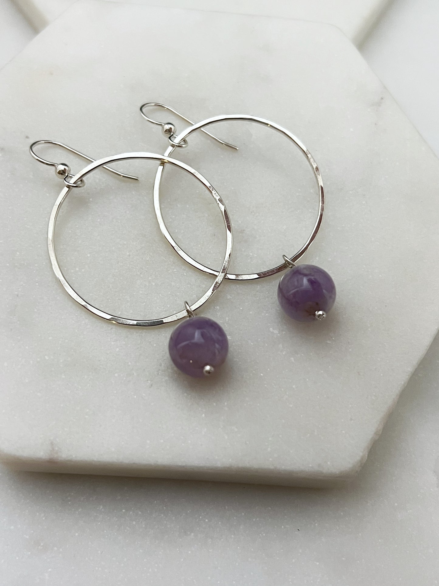 Sterling silver forged hoop earrings with amethyst gemstones wrapped at the bottom. These earrings are 2 inches long by 1.25 an inches wide. The ear wires are sterling silver.