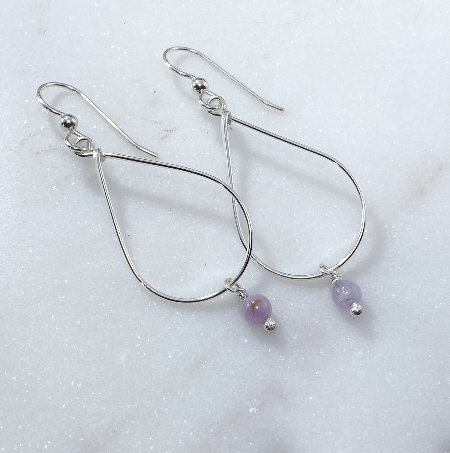 Sterling silver and amethyst teardrop earrings. These lightweight earrings are just over .75 wide by just under 1.75 long. Ear wires are sterling silver