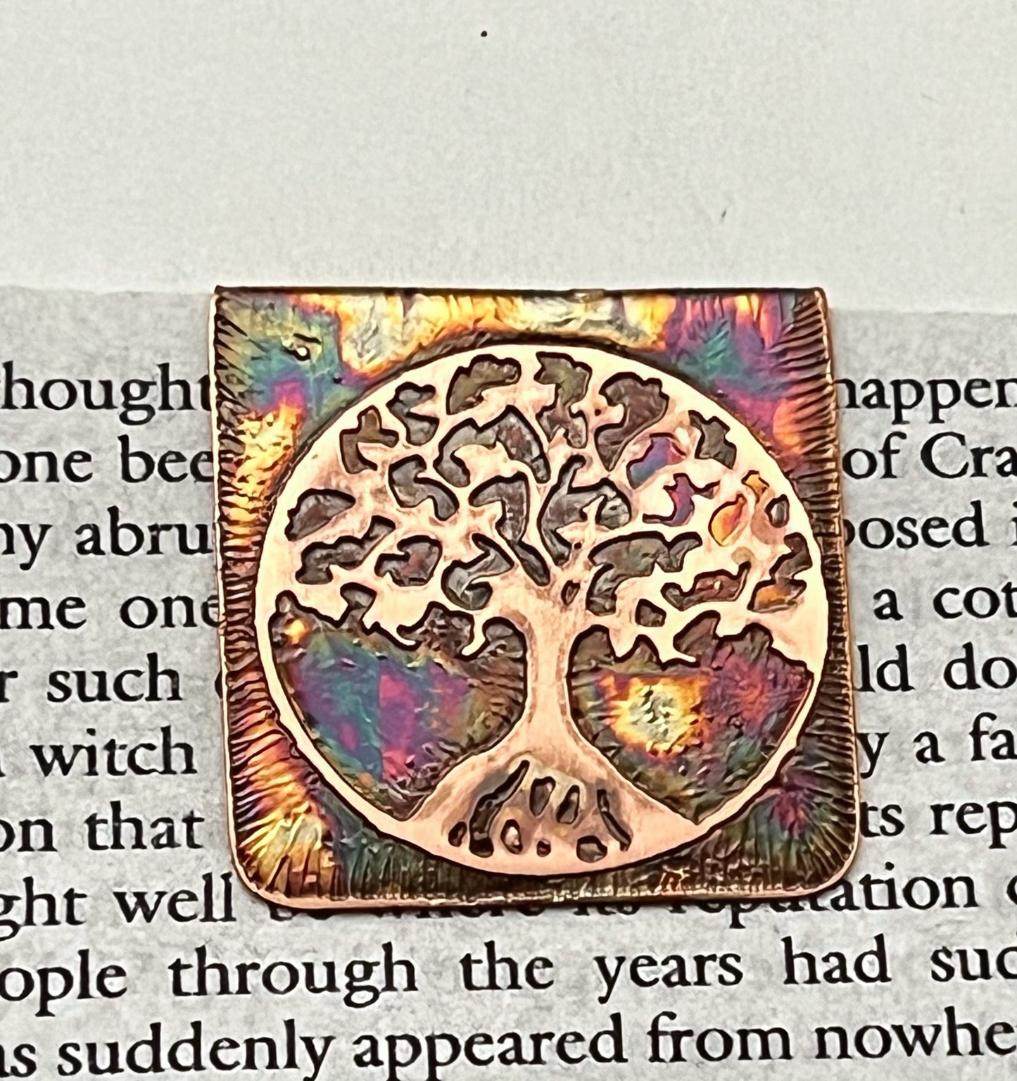 Acid etched copper tree bookmark. This bookmark folds over a few pages to secure it in place without damaging the book. It has been colored with a chemical patina and sealed to prevent tarnish.