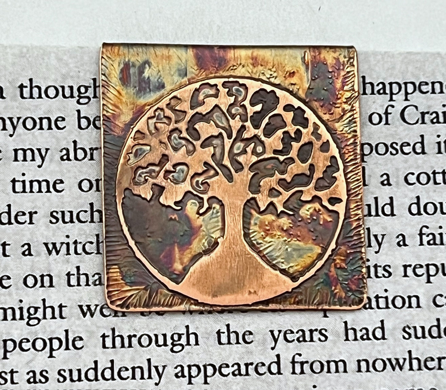 Acid etched copper tree  bookmark. This bookmark folds over a few pages to secure it in place without damaging the book. It has been colored with a chemical patina and sealed to prevent tarnish.